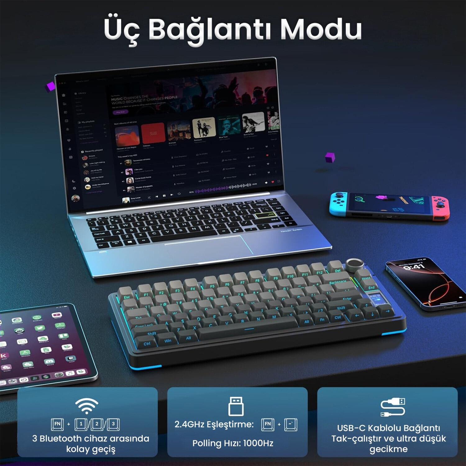 Donanım Bağlantısı: USB ve 2.4G alıcı hot-swap destekli, BT modunda ilgili kanala geçip eşleştirilir