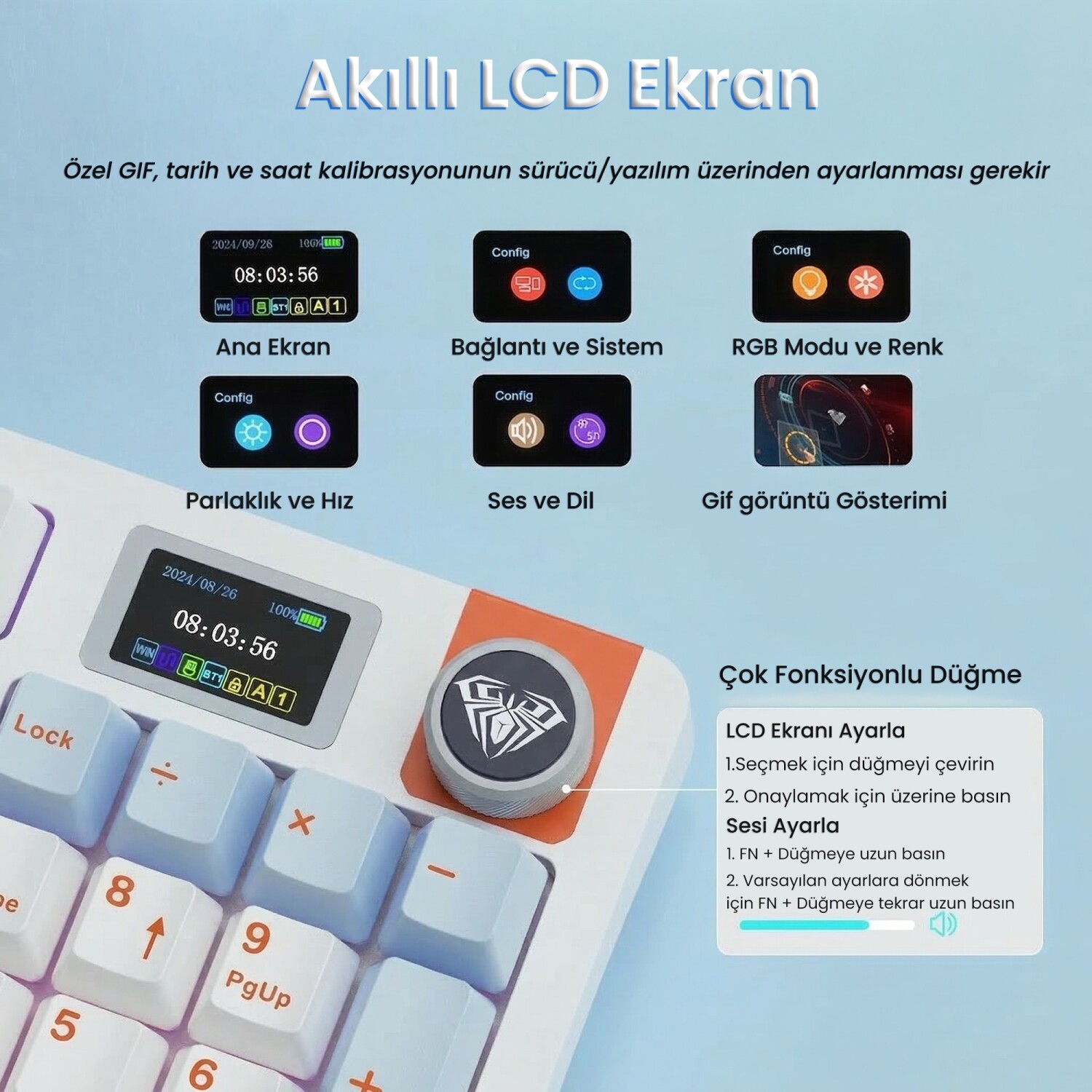 AULA S98 PRO’nun en dikkat çekici özelliklerinden biri klavyenin sağ üst köşesinde bulunan akıllı LCD ekranıdır. Bu ekran sayesinde klavyenizin çalışma durumunu anlık olarak takip edebilirsiniz. Saat, tarih, batarya seviyesi, bağlantı türü ve aktif işletim sistemi gibi bilgiler ekranda görüntülenebilir. Num Lock, Caps Lock ve Win Lock gibi kilit durumları da ekrandan kolayca kontrol edilebilir. Kullanıcı deneyimini daha da kişiselleştirmek isteyenler için klavyeye özel yazılım aracılığıyla LCD ekrana GIF animasyonları yükleme imkanı da sunulmaktadır. Böylece masaüstü kurulumunuza karakter katabilir ve klavyenizi tamamen kişisel bir görünüme dönüştürebilirsiniz.