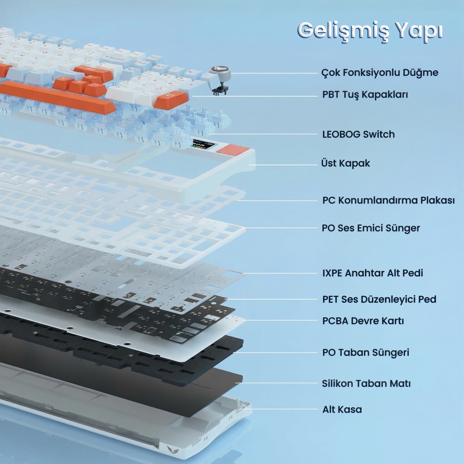 AULA S98 PRO yalnızca switch kalitesiyle değil aynı zamanda iç yapı tasarımıyla da dikkat çeker. Klavye içinde kullanılan ses yalıtım katmanları ve stabilizer yapısı, tuş vuruşlarının daha tok ve dengeli bir akustik üretmesini sağlar. Bu sayede hem yazı yazarken hem de oyun oynarken daha kaliteli bir mekanik klavye hissi elde edilir.