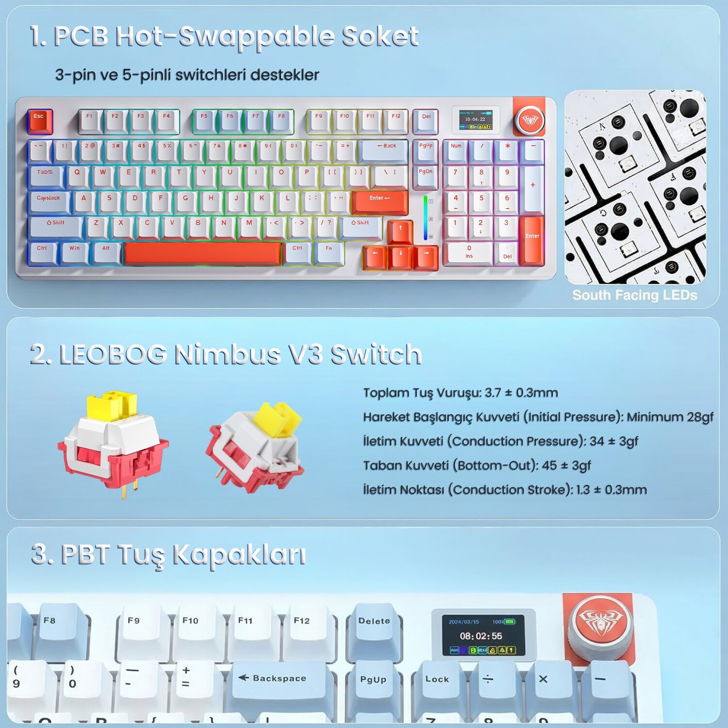 Mekanik klavye kullanıcılarının en çok önem verdiği özelliklerden biri switch deneyimidir. AULA S98 PRO, hot-swap destekli PCB yapısı sayesinde switch değişimini oldukça kolay hale getirir. Lehimleme gerektirmeden farklı switch türlerini deneyebilir ve klavyenizin hissiyatını tamamen kendi tercihlerinize göre değiştirebilirsiniz.