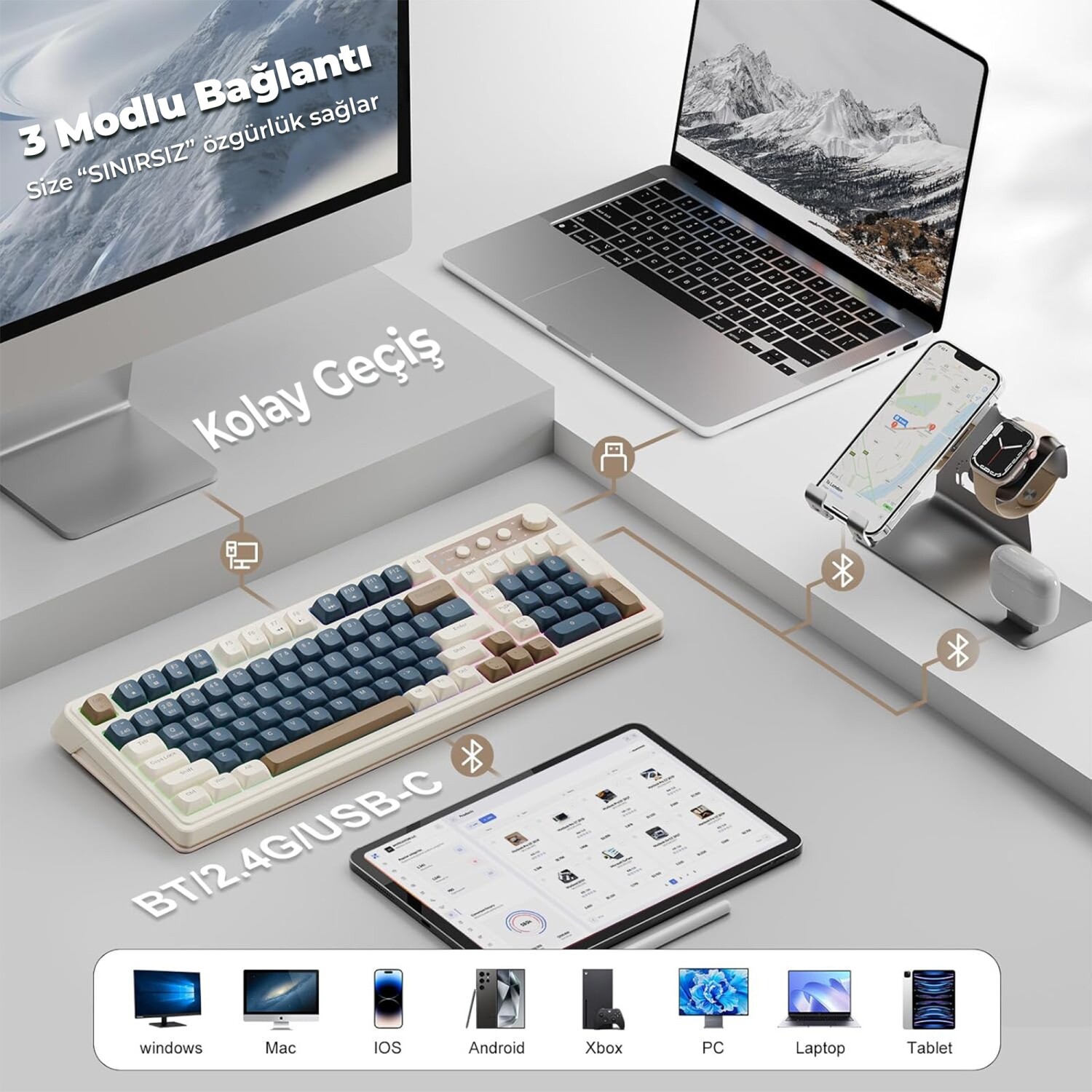Bu gaming klavye, Bluetooth 5.0, 2.4GHz kablosuz ve USB-C kablolu olmak üzere üç farklı bağlantı modu sunar. Retro klavye tasarımında aynı anda 5 cihaza bağlanabilir ve FN+ tuş kombinasyonu ile kolay geçiş yapabilirsiniz. Oyun klavyesi olarak ev, ofis ve dış mekan kullanımı için sınırsız bağlantı imkanı sağlar.