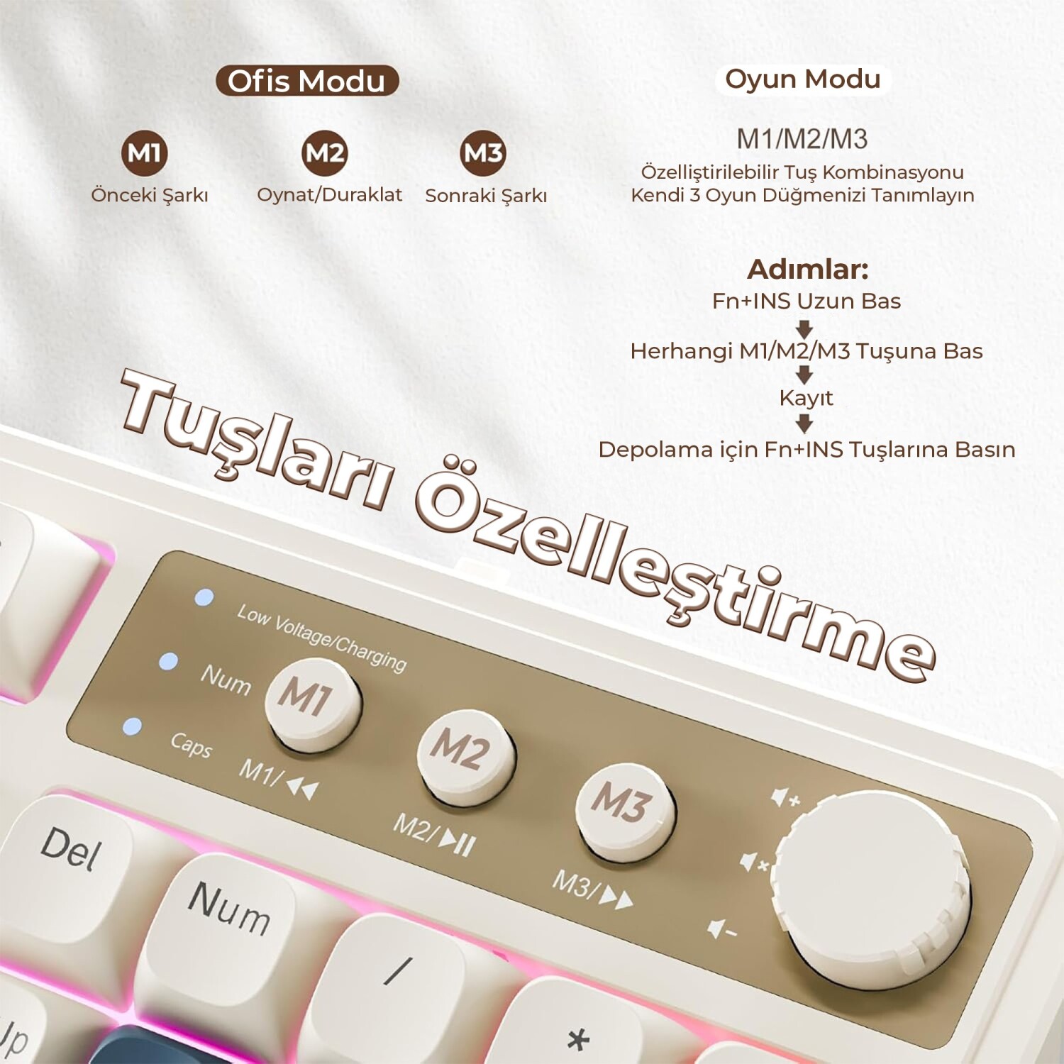 Bu gaming klavye, sağ üstteki çevrilebilir tuşa uzun basış ile ofis ve oyun modları arasında kolay geçiş imkanı sunar. Oyun modunda makro tuşlarına özel işlevler kaydedebilir ve tek tıkla karmaşık aksiyonları gerçekleştirebilirsiniz. Çevrilebilir düğme bu modda RGB klavye aydınlatmasının parlaklığını ayarlamak için kullanılır. Ofis modunda ise makro tuşları multimedya kontrollerine dönüşür ve çevrilebilir düğme ses yüksekliğini artırıp azaltmanızı sağlar. Bu retro klavye özelliği sayesinde hem oyun hem de iş ortamında maksimum verimlilik elde edersiniz.