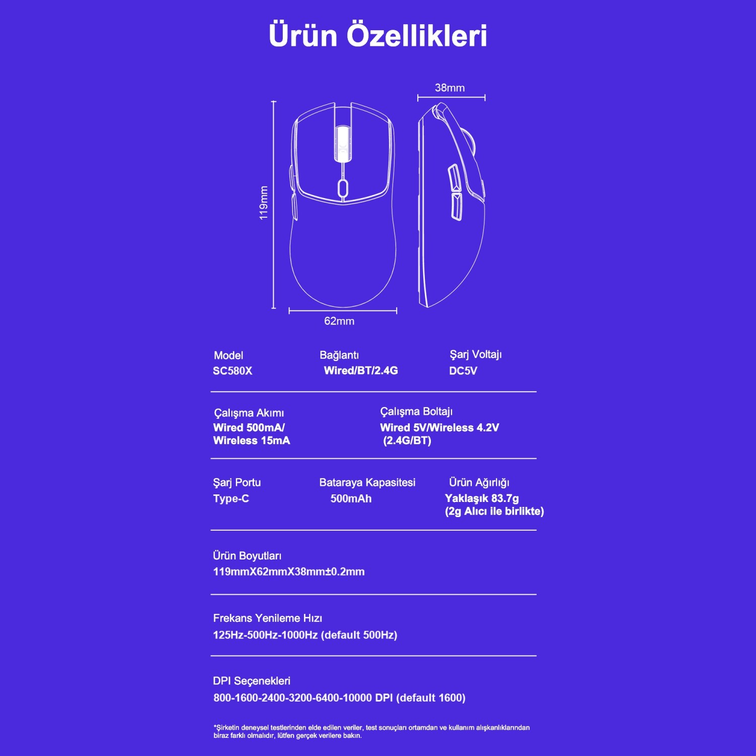 500mAh batarya kapasitesi ile 10-14 gün kullanım süresi (günde 5 saat) sunan gaming mouse, USB-C ile hızlı şarj imkanı sağlar. 10 milyon tıklama dayanıklılığı ile uzun ömürlü kullanım garantisi verir.