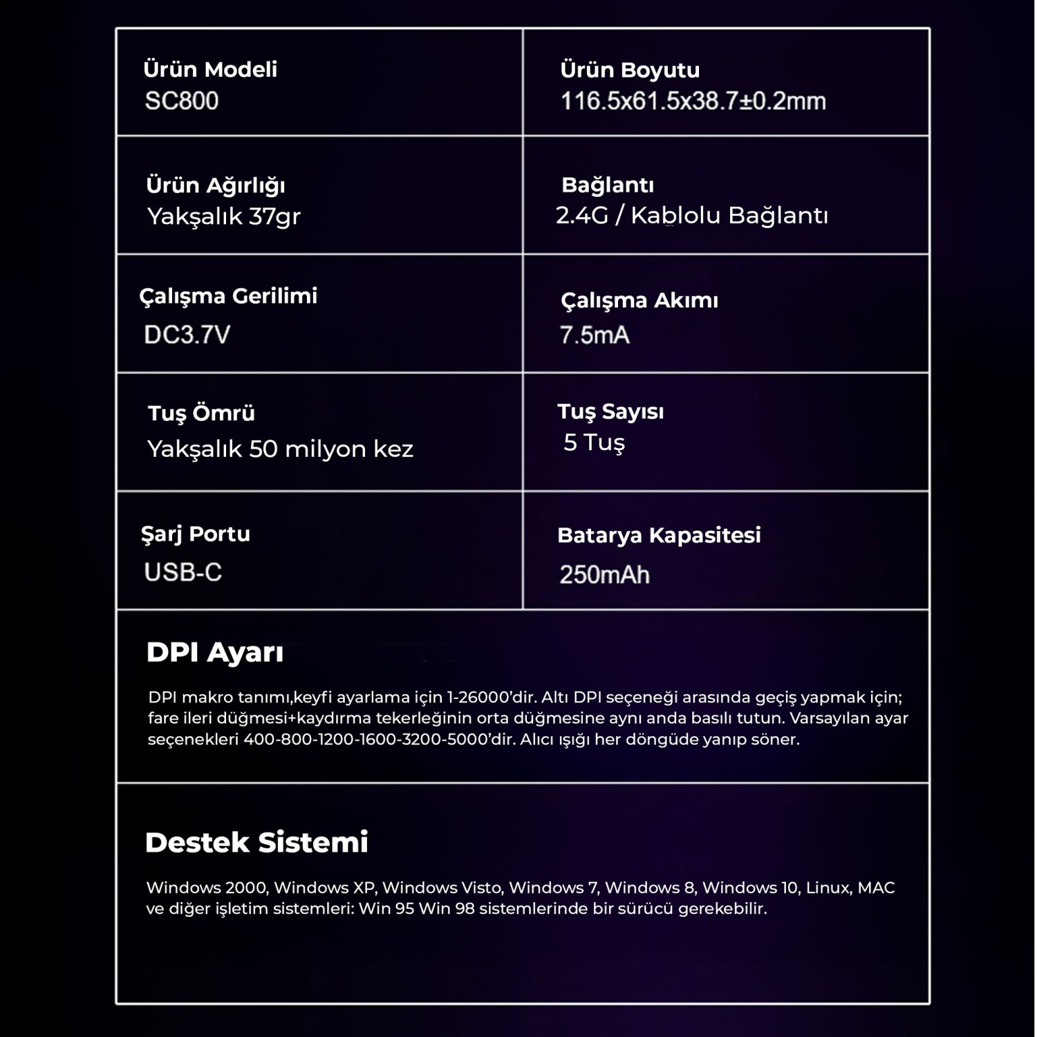 PAW3395 amiral gemisi sensör ile donatılmış SC800 mouse, hızlı tempolu oyunlarda bile hareketlerinizin doğru şekilde izlenmesini sağlayarak olağanüstü hassasiyet sunar. Yüksek 650 IPS hızı ve 50G hızlanma, üstün yanıt verme özelliği sunarak bu mouse'u her hareketin önemli olduğu FPS ve MOBA oyunları için mükemmel hale getirir. İster hassas kafadan vuruşları hedefleyin ister hızlı manevralar yapın, SC800 her hareketinize uyum sağlar.