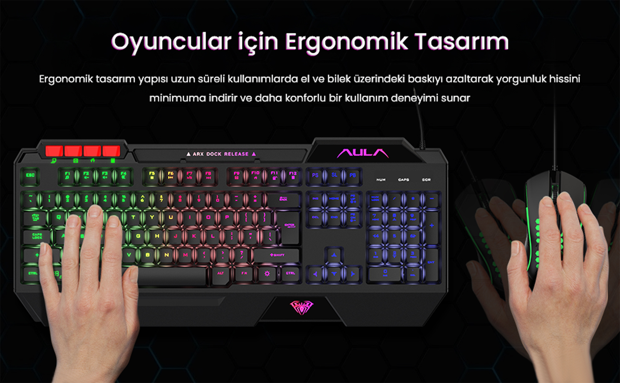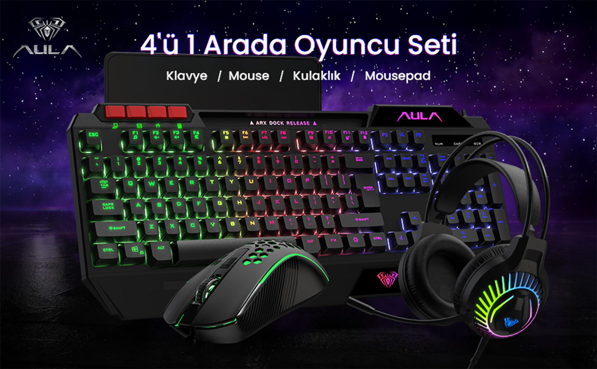 AULA T650 4'ü 1 Arada Oyuncu Seti, yüksek performanslı RGB aydınlatmalı klavye, ultra hafif petek tasarımlı 3600 DPI gaming mouse, profesyonel 50mm sürücülere sahip mikrofonlu oyuncu kulaklığı ve yüksek hassasiyetli kaymaz mouse pad'den oluşan eksiksiz bir donanım paketidir. Birbiriyle hem görsel hem de performans açısından tam uyumlu çalışan bu set, rekabetçi oyunlarda size üstünlük sağlarken ergonomik tasarımıyla uzun oyun maratonlarında yorgunluğu en aza indirir.