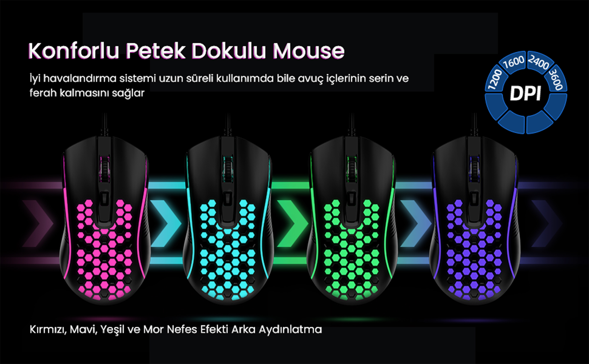 Yalnızca 81 gram ağırlığındaki yenilikçi delikli (petek) tasarımı, farenin elinizde adeta tüy gibi hafif hissedilmesini sağlarken, uzun süreli kullanımlarda el terlemesini minimuma indirir. Oyunun türüne göre anında hız değiştirebilmeniz için 1200, 1600, 2400 ve 3600 DPI seçenekleri arasında tek tuşla geçiş yapabilirsiniz. DPI seviyesine göre Kırmızı, Mavi, Yeşil ve Mor renkler arasında kademeli olarak değişen RGB arka aydınlatması, şık ve dikkat çekici bir görünüm sunar.