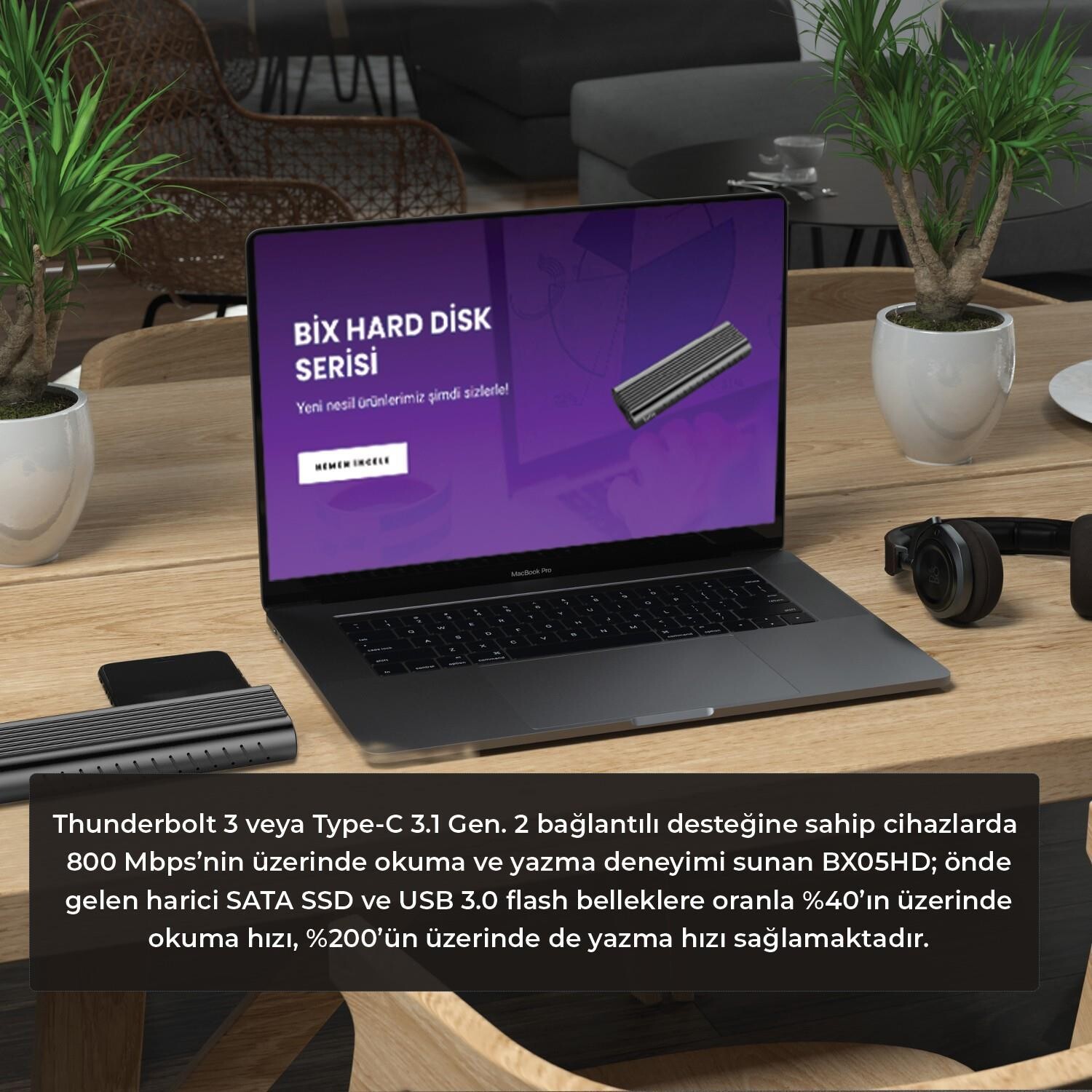 Bix BX05HD Type-C 3.1 Gen2 to PCIe NVMe M.2 SSD Disk Kutusu ile hiçbir aparat gereksinimi duymadan M.2 NVMe SSD’nizi taşınabilir depolama alanına çevirebilirsiniz. Type-C portuna sahip tüm cihazlarınız üzerinden hard diskinizi görüntüleyebilir, hızlı veri transferinin keyfini sürebilirsiniz. BX05HD, üzerindeki ayarlanabilir mandalı ile 2280, 2260, 2242, 2230 dahil olmak üzere birden fazla M.2 NVMe SSD uzunluğunu desteklemektedir. Thunderbolt 3 veya Type-C 3.1 Gen. 2 bağlantı desteğine sahip cihazlarda 800 MBps’nin üzerinde okuma ve yazma deneyimi sunan BX05HD; önde gelen harici SATA SSD ve USB 3.0 flash belleklere oranla %40’ın üzerinde okuma hızı, %200’ün üzerinde de yazma hızı sağlamaktadır.