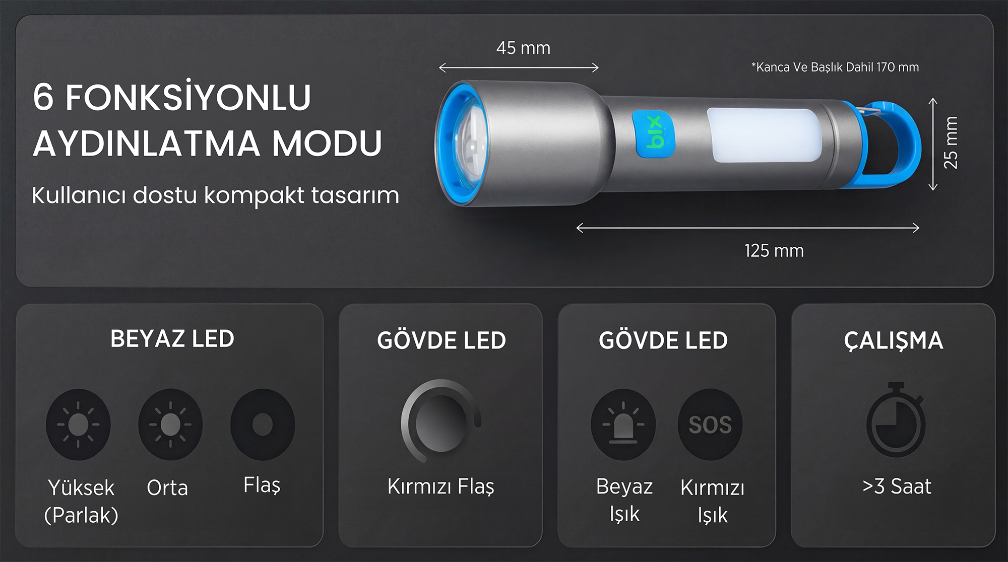 Aydınlatma Modları: Ana LED (Yüksek, Orta, Flaş) / COB Panel (Beyaz, Kırmızı, Kırmızı Flaş/SOS)
