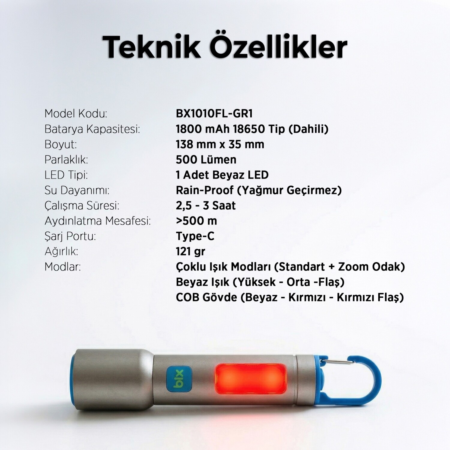 1 x Bix BX1010FL-GR1-Şarj Edilebilir El Feneri