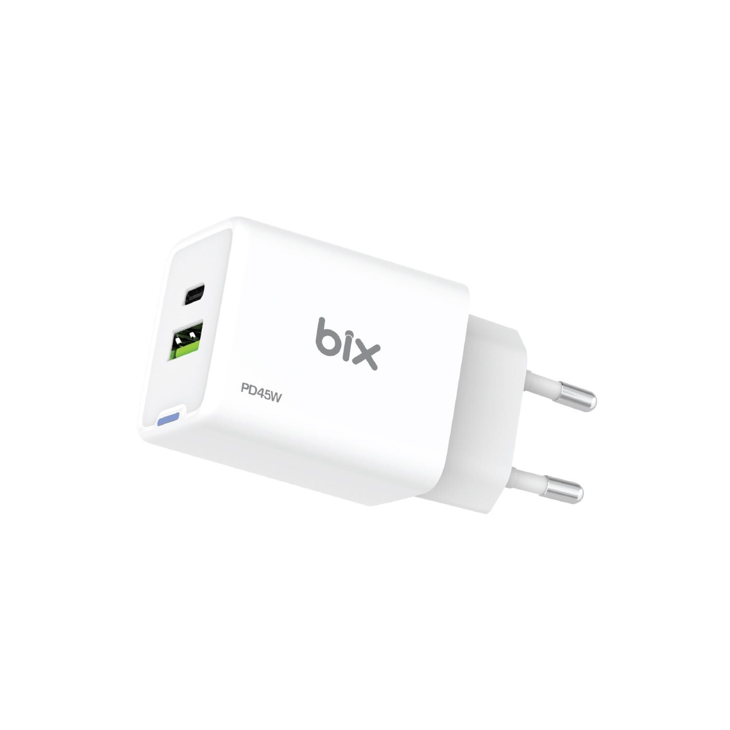 Bix BX2P46G GaN PD 45W Çift Portlu Akım Korumalı Hızlı Şarj Cihazı, 45W PD3.0 destekleyen bir Type-C ve 18W QC destekleyen bir USB-A portuna sahiptir. Üstün akıllı çipiyle akıllı telefon, tablet ve dizüstü bilgisayarlarınızı hızlı bir şekilde şarj eder.