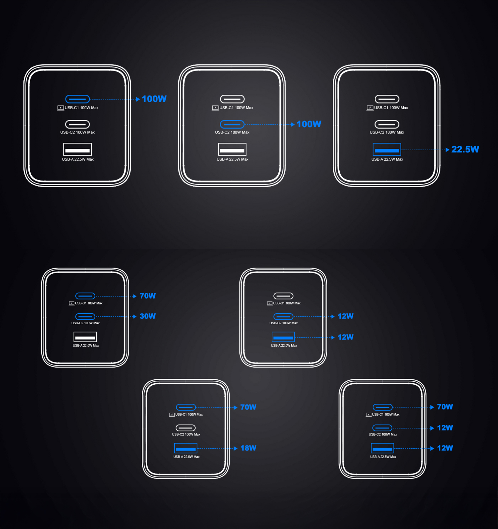 • USB-C2 + USB-A: 12W + 12W