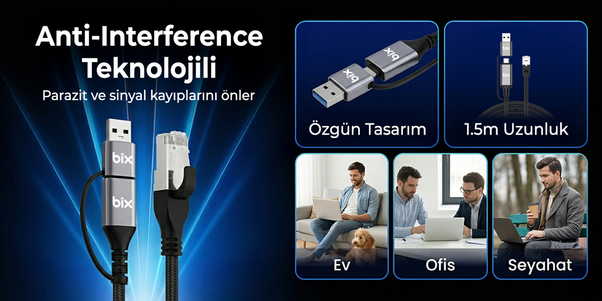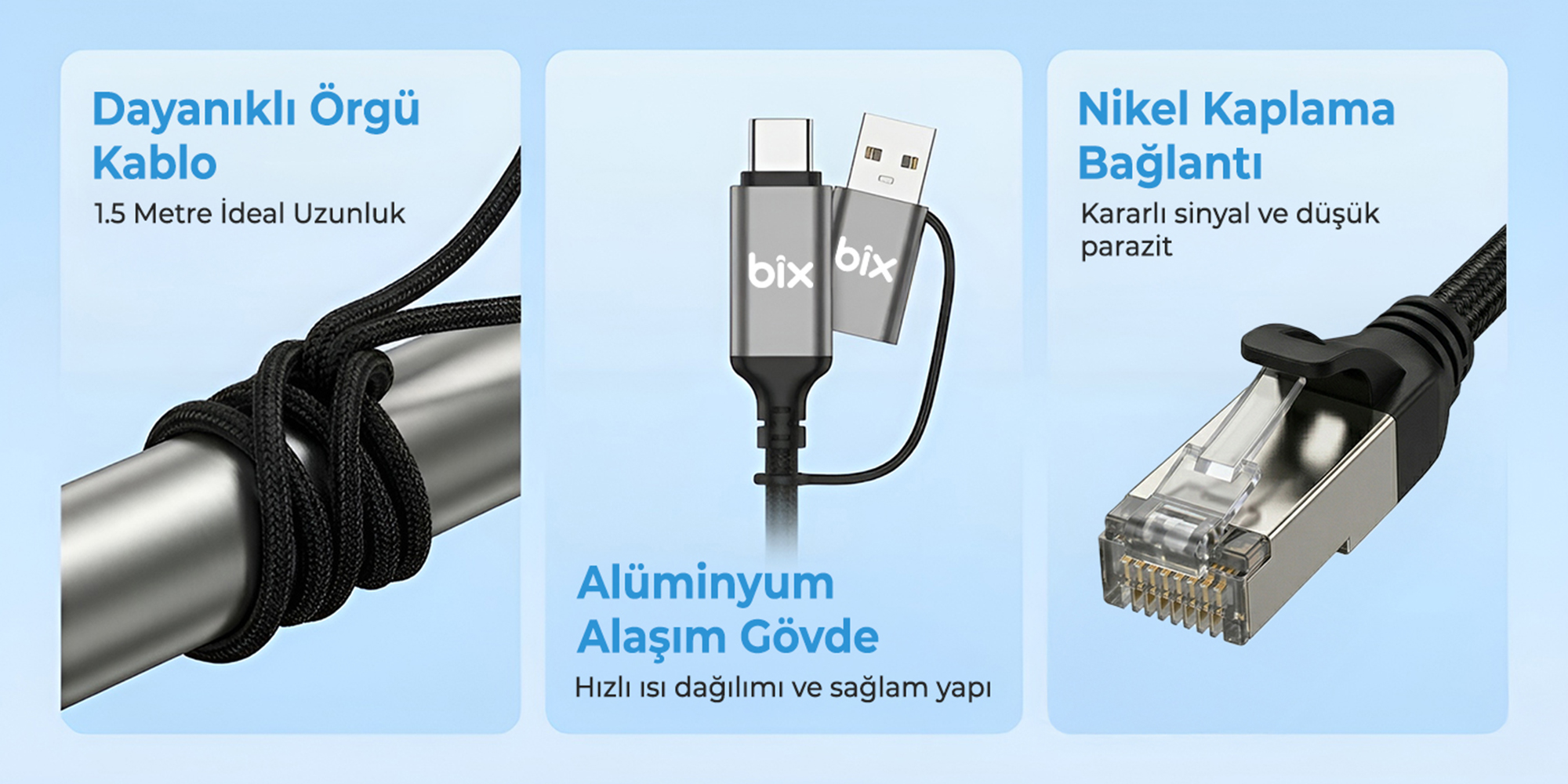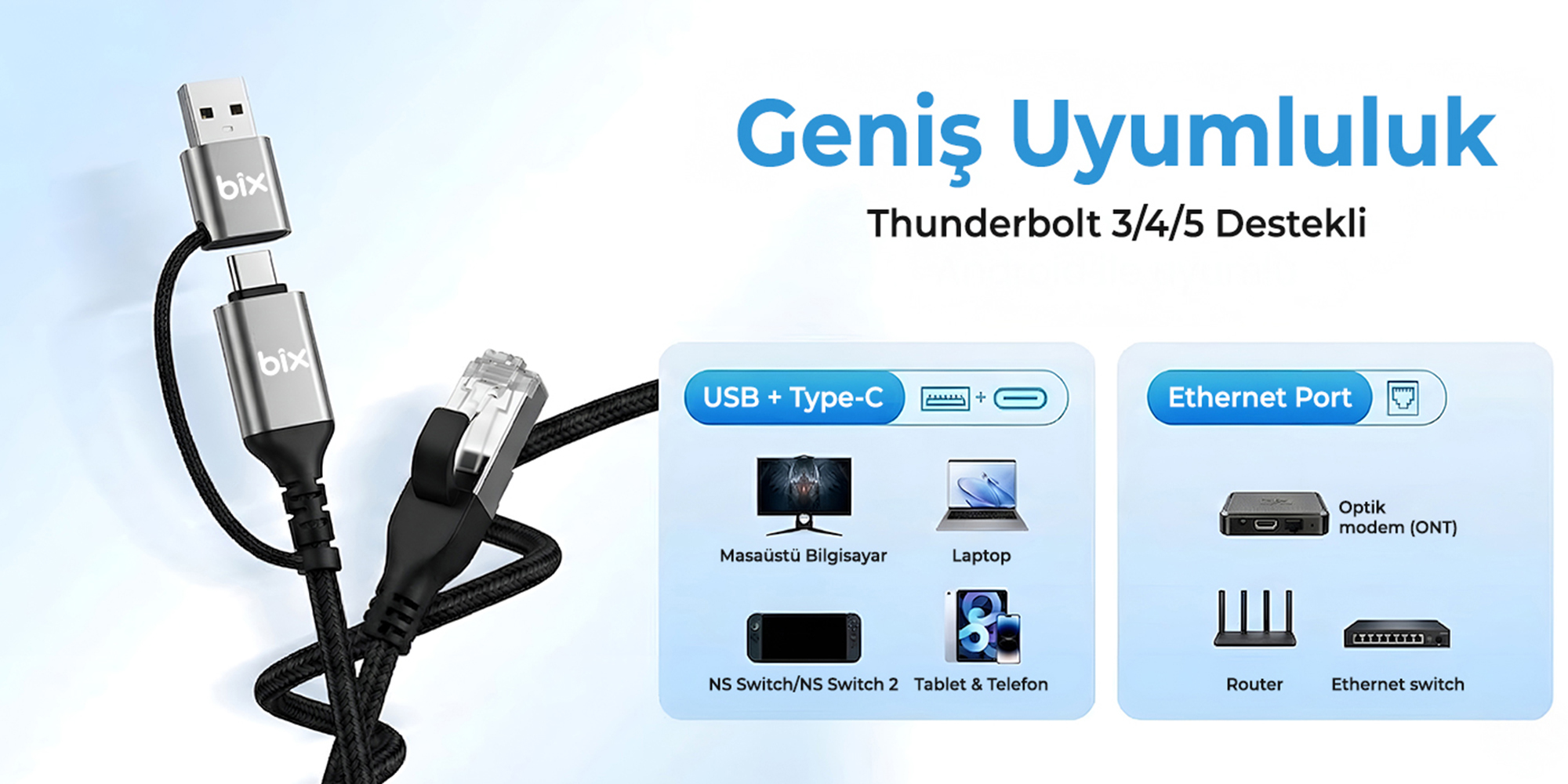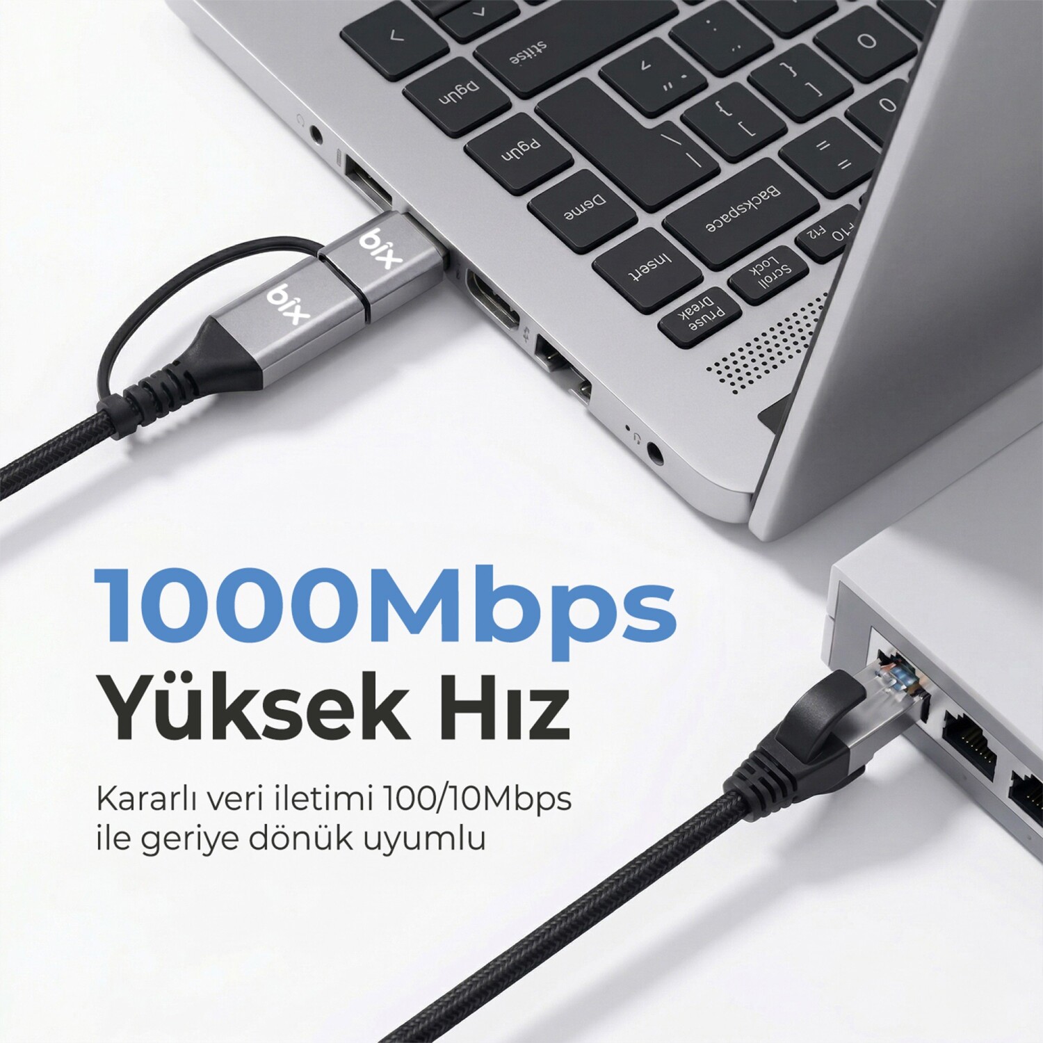 1 x Bix C6AC15 2in1 USB-A & Type-C to RJ45 1000Mbps Gigabit Ethernet Dönüştürücü CAT6 Kablo 1.5 Metre