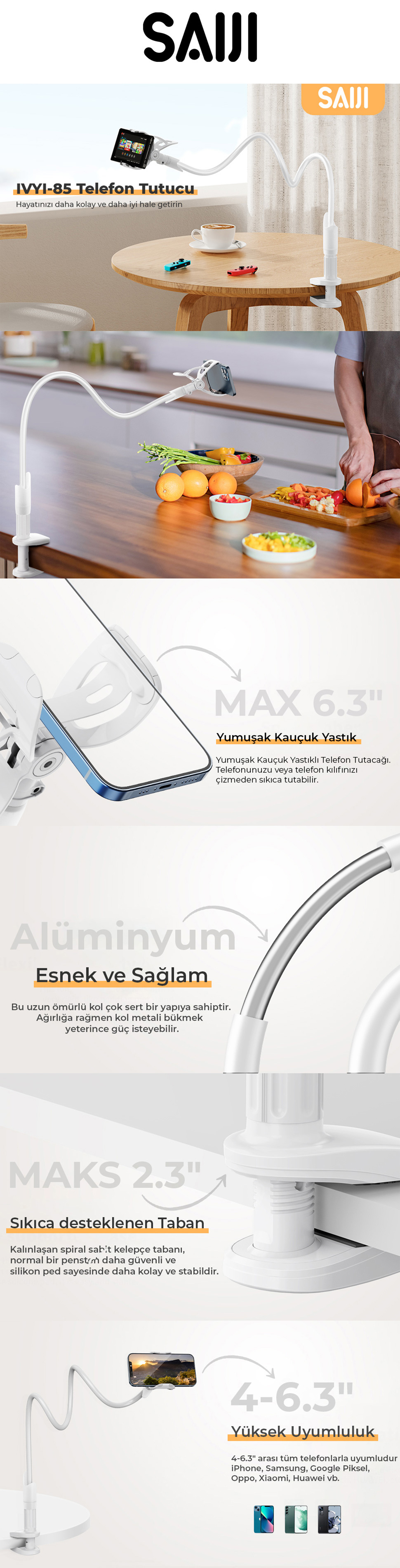 Bix saiji IVY akrobat esnek telefon tutucu, 360 derece dönebilen 85cm uzunluğundaki esnek kolu ile telefonunuzu istediğiniz açıda konumlandırmanızı sağlar. Bu sayede akıllı telefonunuz ile vakit geçirirken, cihazınızı sizin için en rahat ve en uygun olan konuma hızlı bir şekilde ayarlamanıza olanak tanır. Esnek gövdesi ve telefon tutucunun kelepçesi, kullanırken kazayla çarpmanız durumunda sallanmayı azaltmaya yardımcı olan alüminyum-magnezyum alaşımından yapılmıştır. 4 - 6.3 inç arası bütün cihazlarla uyumludur. Telefon tutucunun kolu, 8.5 mm kalınlığında alüminyum alaşımdan üretilmiştir.