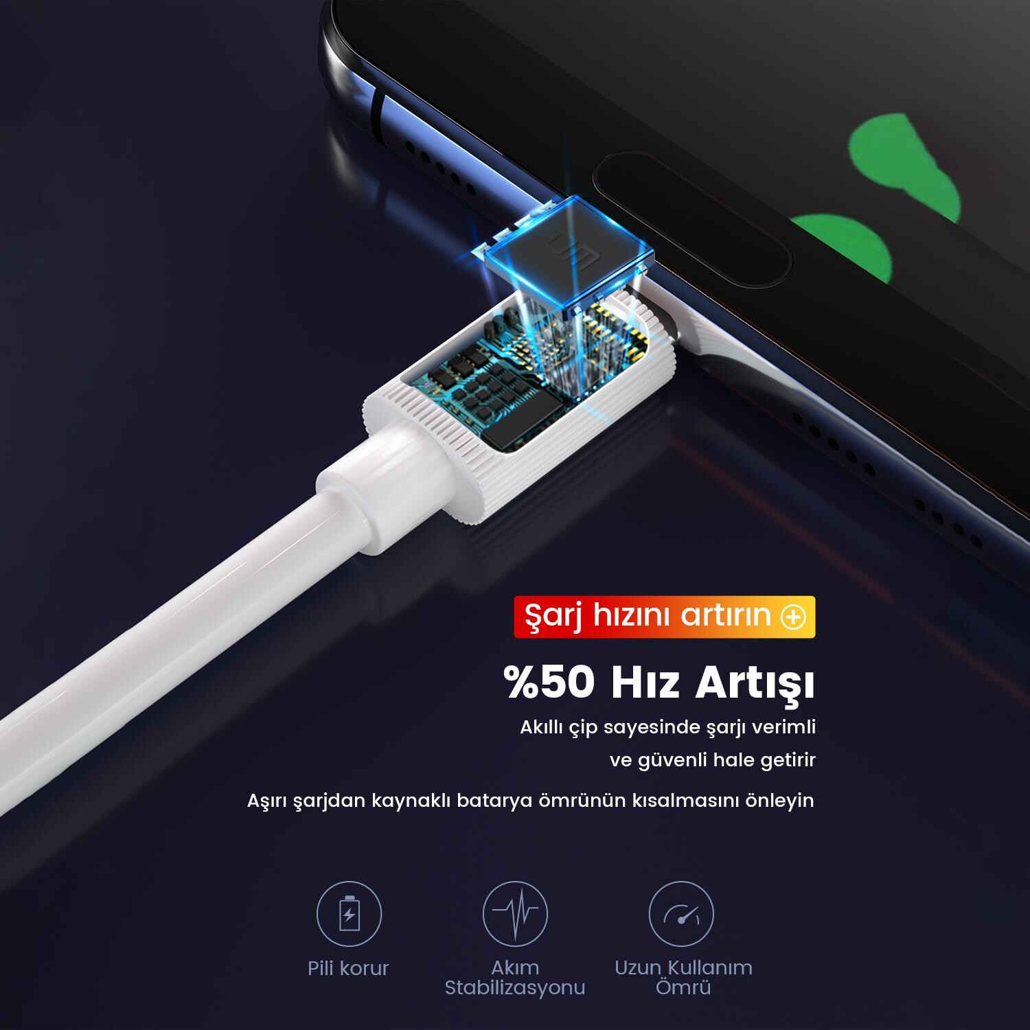 DM SL010 Apple iPhone USB Lightning Data ve Şarj Kablosu Beyaz 1 Metre, iPhone telefonlarınızı hızlı ve güvenli bir şekilde şarj edip veri aktarmanızı sağlar. 2.4A taşıma kapasitesi sayesinde standart kablolara göre daha hızlı şarj imkânı sunar. Ayrıca 480Mbps dosya aktarım hızı ile verilerinizi zaman kaybetmeden aktarabilirsiniz. Kablo diplerinde yer alan silikon uzantılar kablonun uçlara yakın bölümlerden kırılmasını engeller. Bu sayede daya uzun ömürlü ve güvenli bir kullanım imkânı sunar.