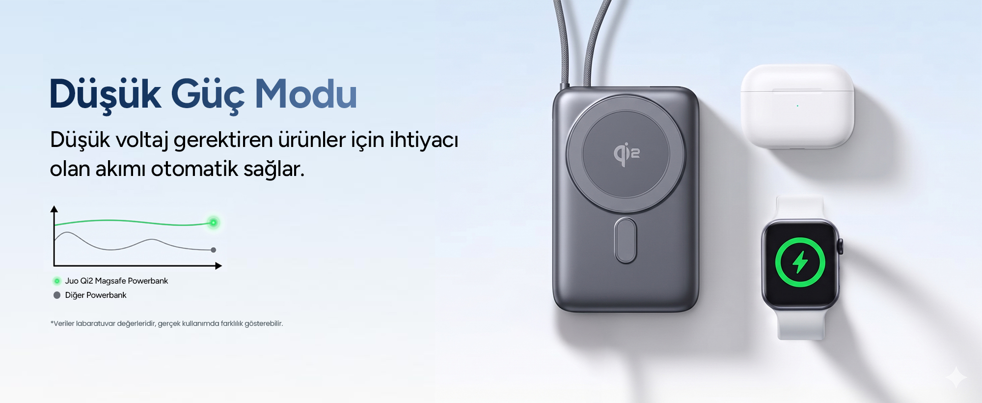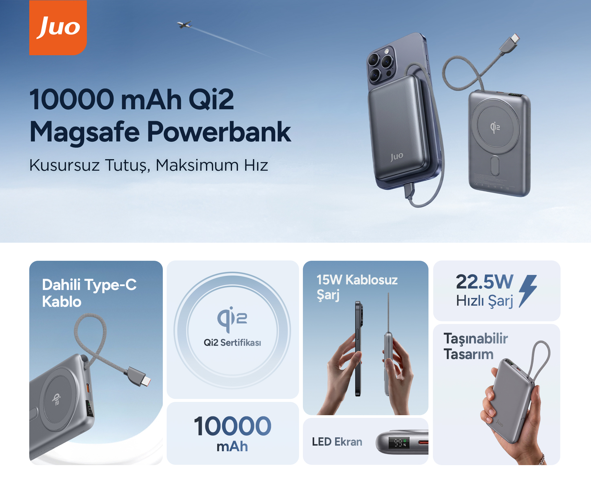 Juo Powerbank, 22.5W kablolu , 15W Qi2 kablosuz şarj desteği ile telefon, tablet , kulaklık gibi farklı cihazları hızlı bir şekilde şarj etmenize olanak tanır. Güç çıkışını cihazınızın ihtiyacına göre ayarlayan şarj teknolojisi, cihazınızın güvenliğini koruyarak şarj etmenizi sağlar.