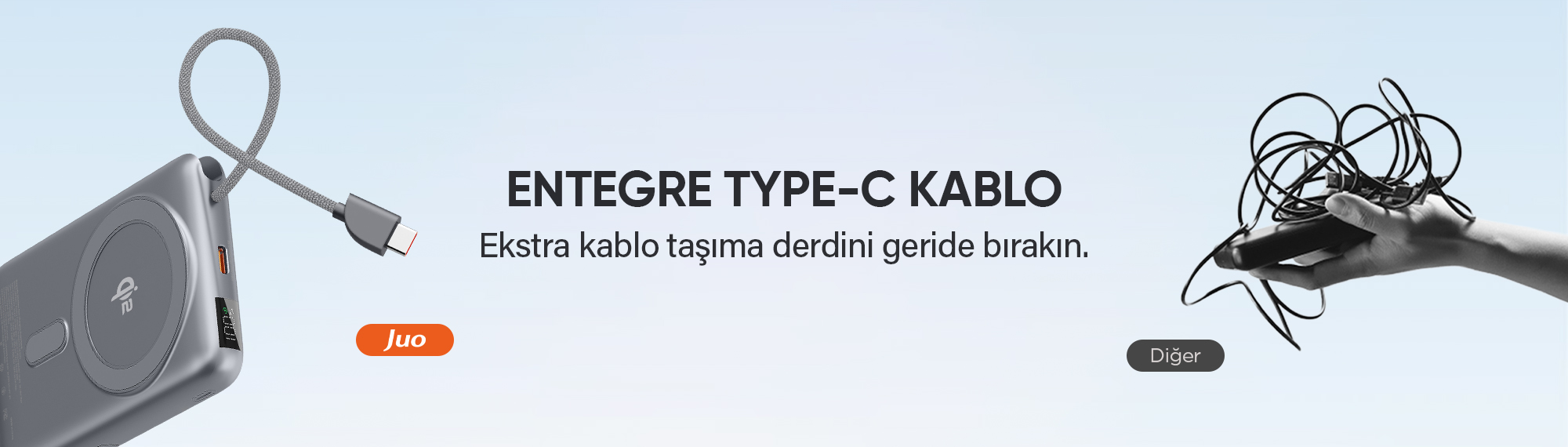 Juo Powerbank, entegre Type-C kablo tasarımıyla ekstra kablo ihtiyacını ortadan kaldırır. Kablo saklama ve kaybetme problemine son veren bu tasarım,cihazınızı her an yanınızda olacak şekilde tasarlanmıştır.
