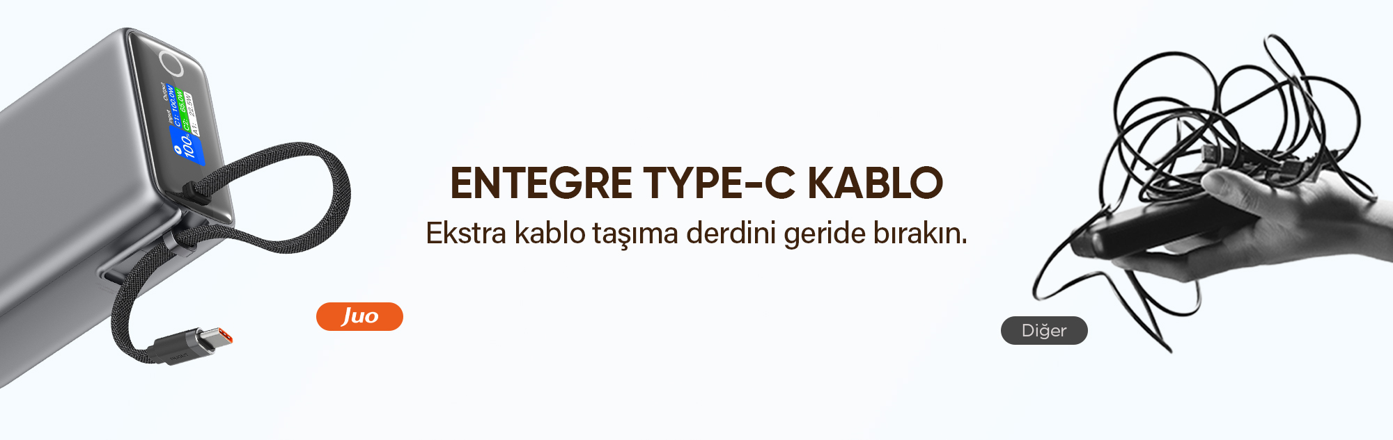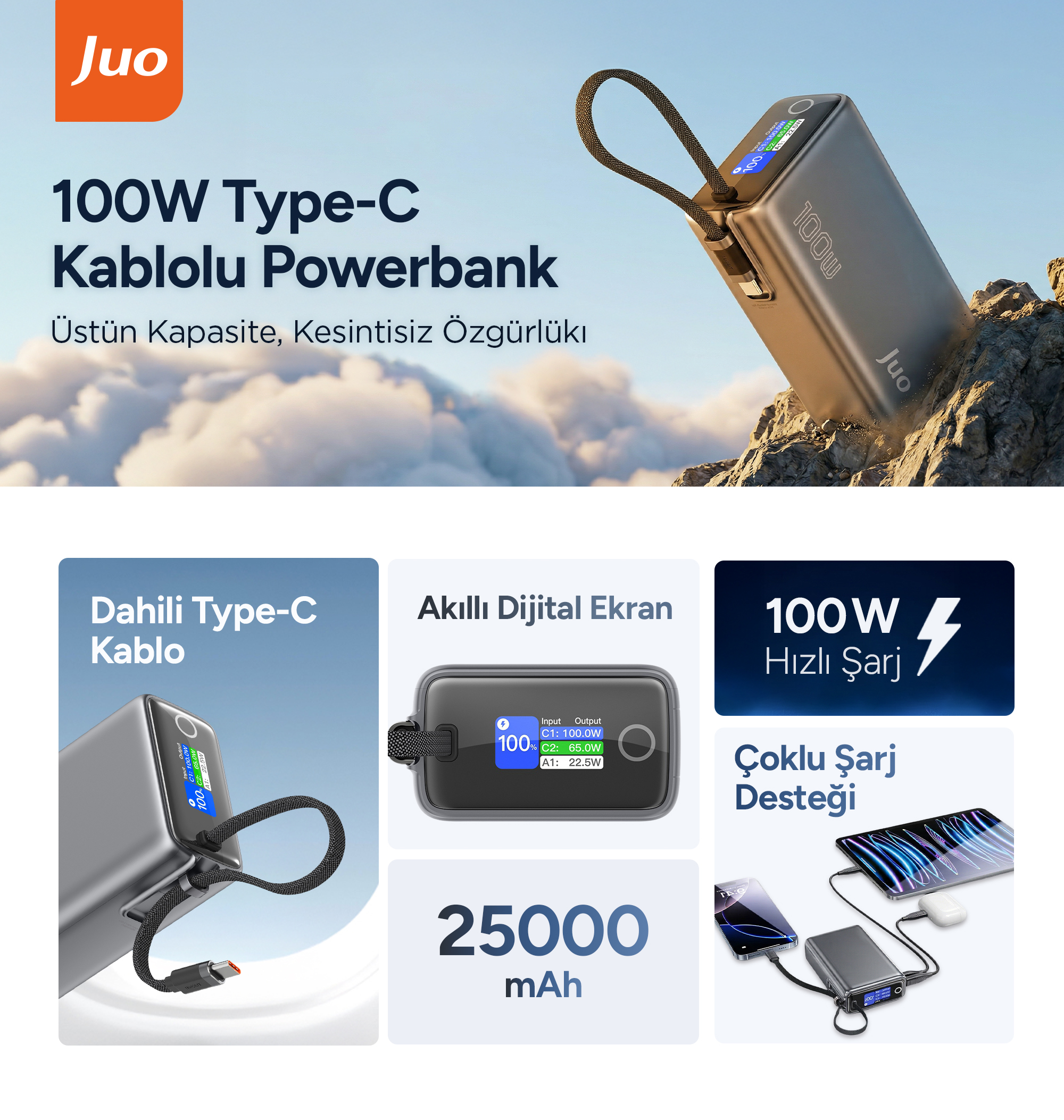 Juo 25000 mAh Type-C Kablolu Powerbank, 100W hızlı şarj desteği ve entegre kablo tasarımıyla akıllı telefon, tablet ve dizüstü bilgisayar gibi farklı cihazları tek seferde şarj etmenizi sağlayan bir güç kaynağıdır. 25000 mAh yüksek kapasite ile seyahatlerinizde veya uzun yolculuklarda cihazlarınızı şarjının bitmesini engeller. Entegre Type-C kablo tasarımı, ekstra kablo ihtiyacını ortadan kaldırarak her an yanınızda olacak şekilde tasarlanmıştır. Akıllı TFT ekranı ile şarj durumunuzu her an takip edebilir, 3 farklı çıkış portu ile aynı anda birden fazla cihazı şarj edebilirsiniz.