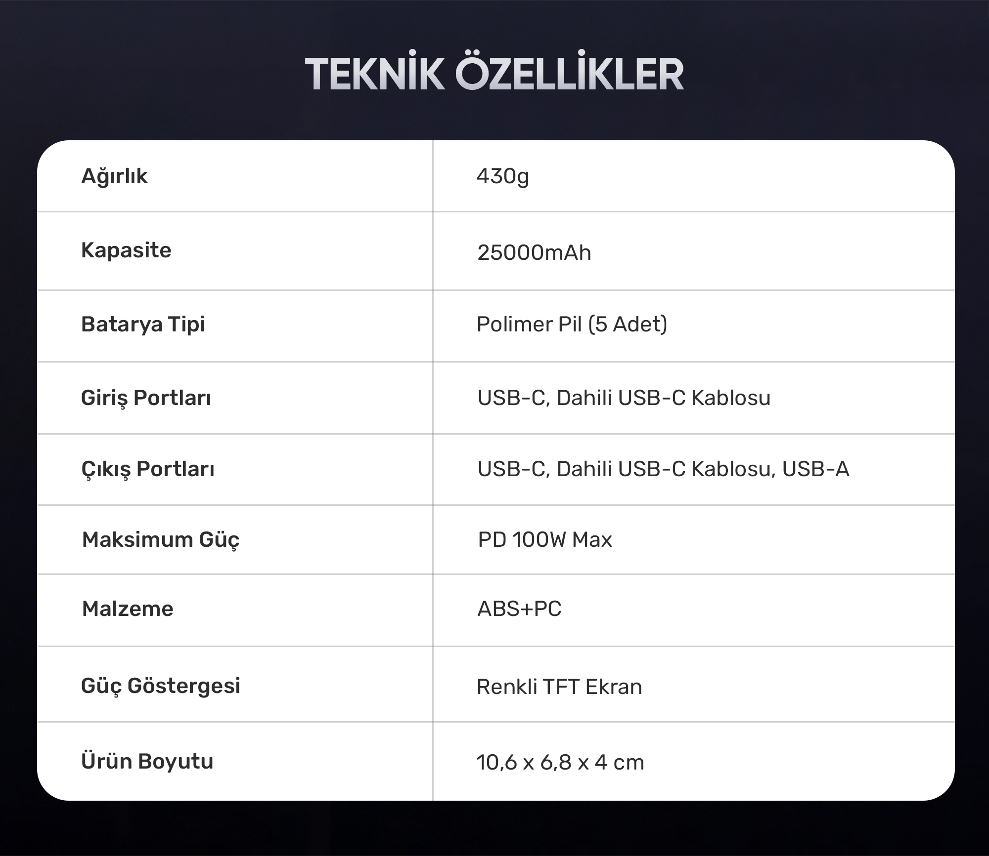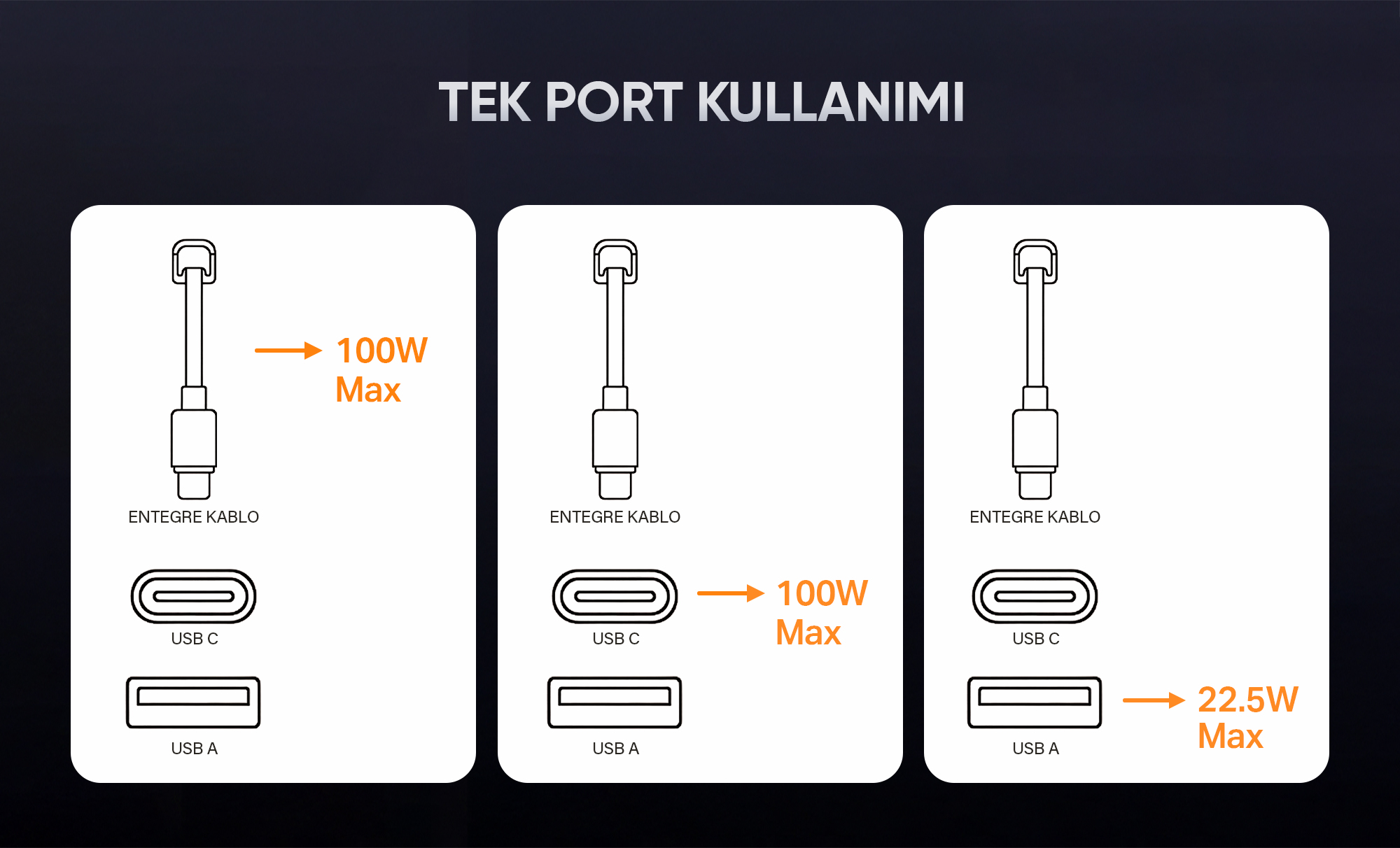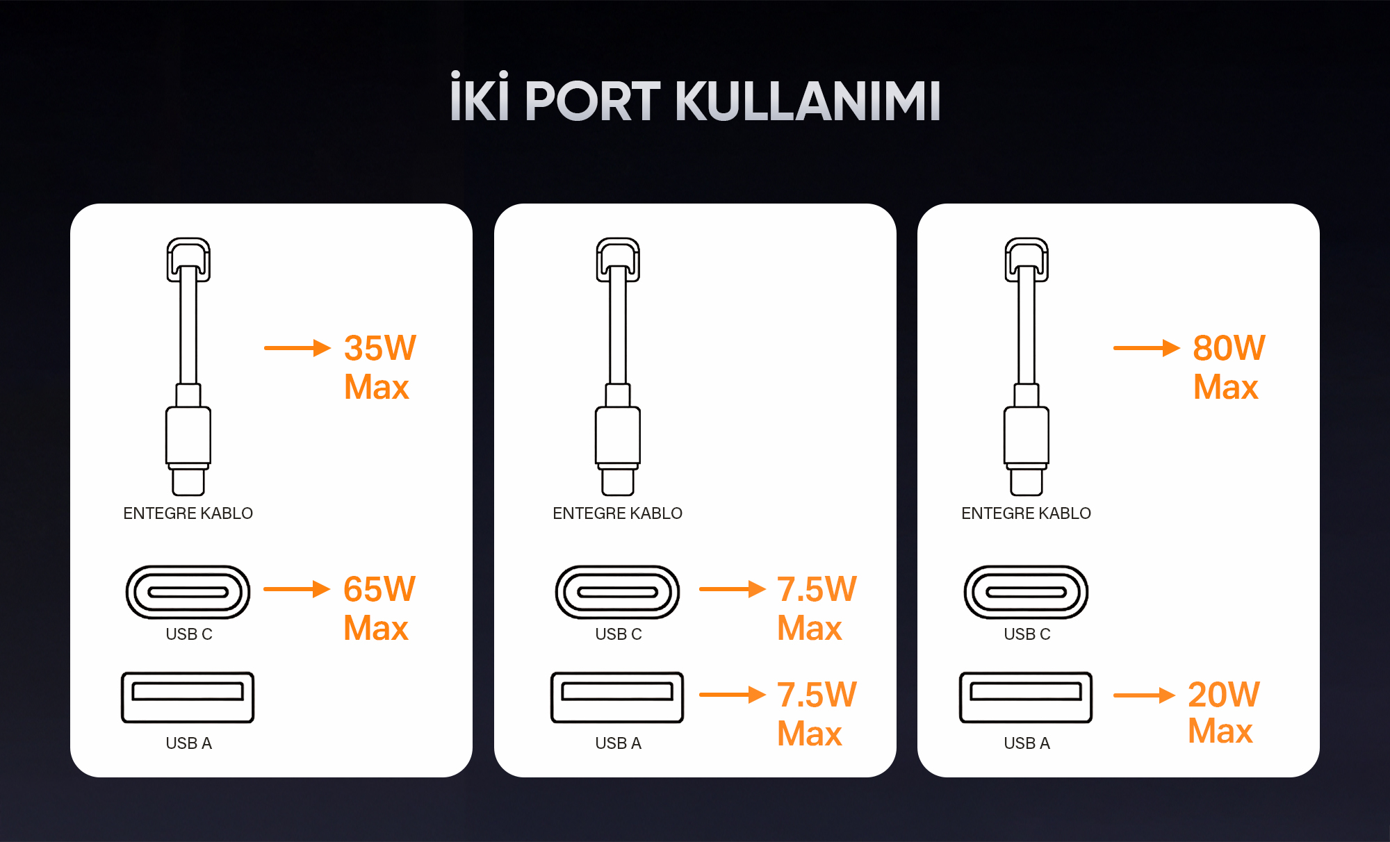 • Çıkış Portları: Type-C, Dahili Type-C Kablosu, USB-A