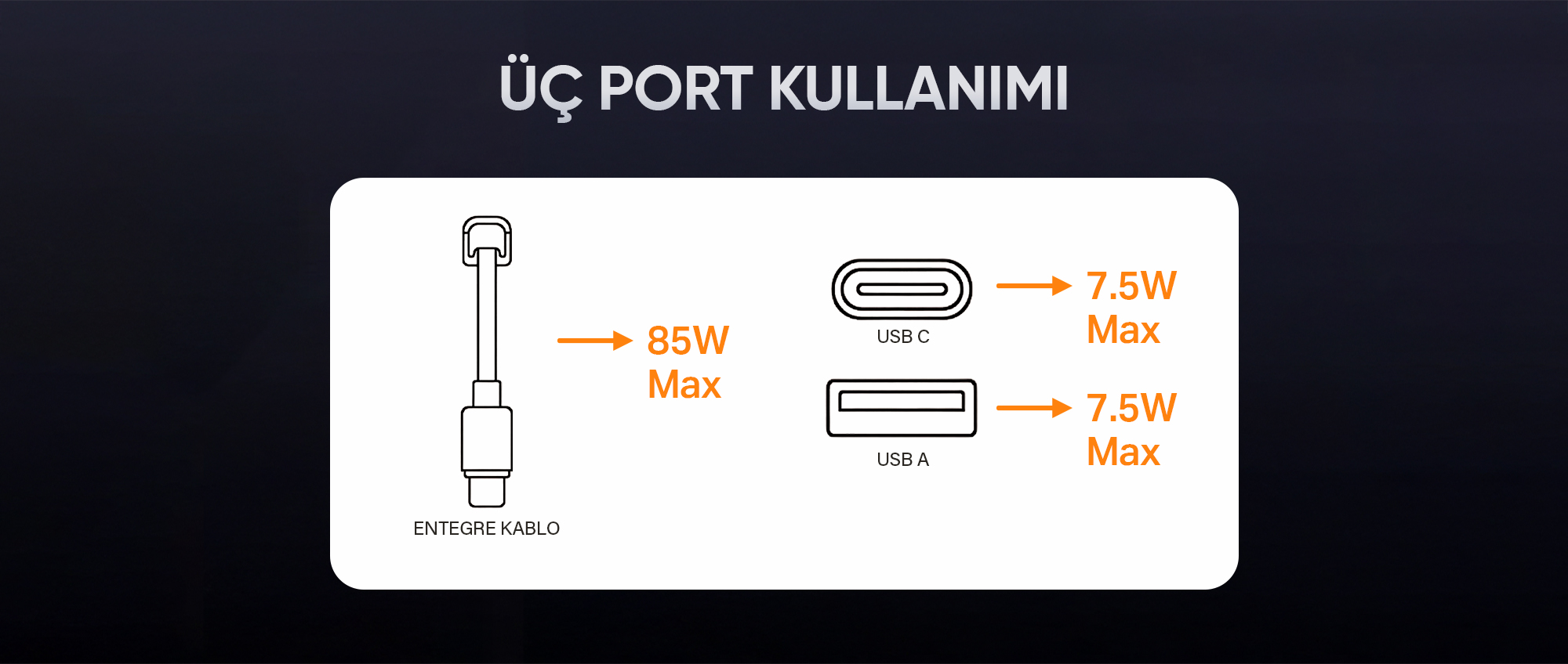 • Kablo + Type-C port + USB-A port ile 85W + 7.5W + 7.5W