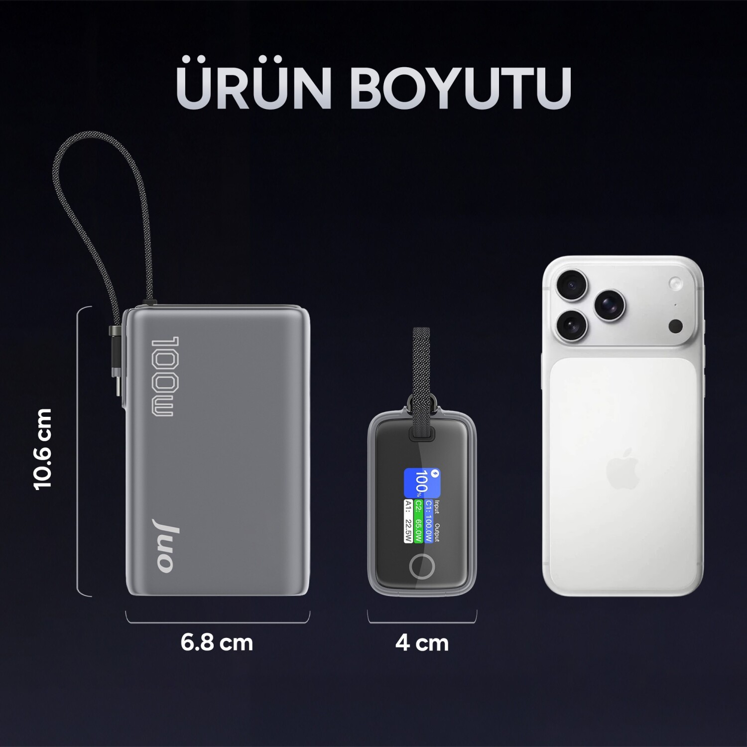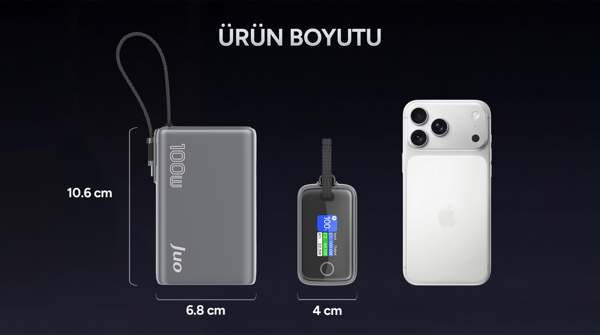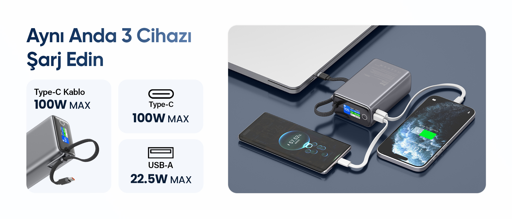 Juo Powerbank, Type-C kablo, Type-C port ve USB-A port ile aynı anda üç farklı cihazı şarj etmenize olanak tanır. Type-C kablo ile 100W, Type-C port