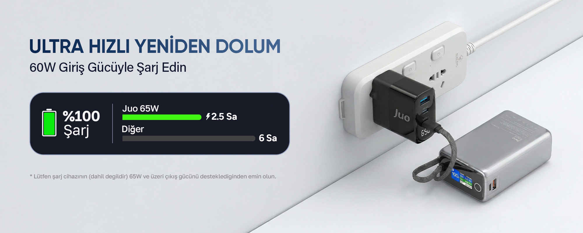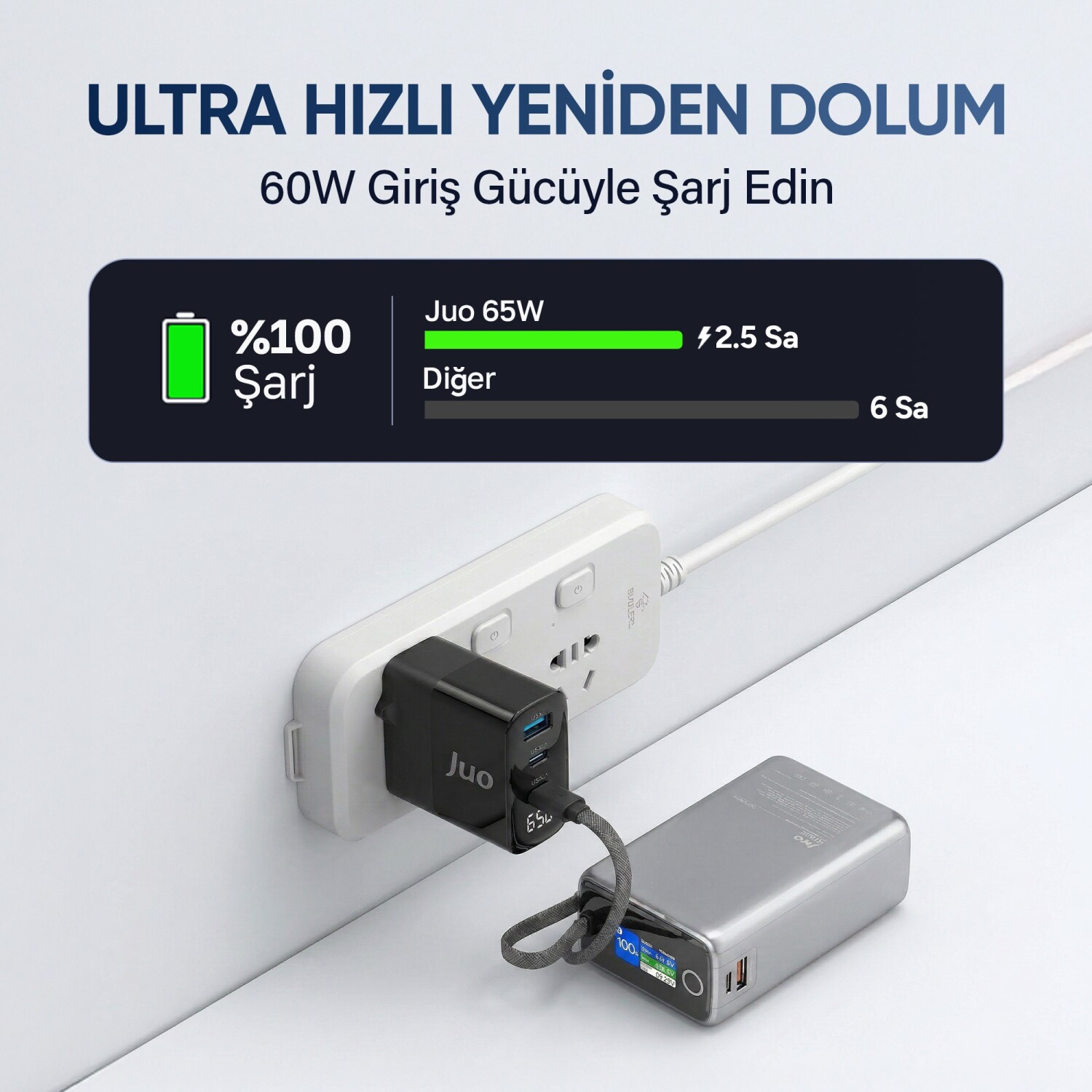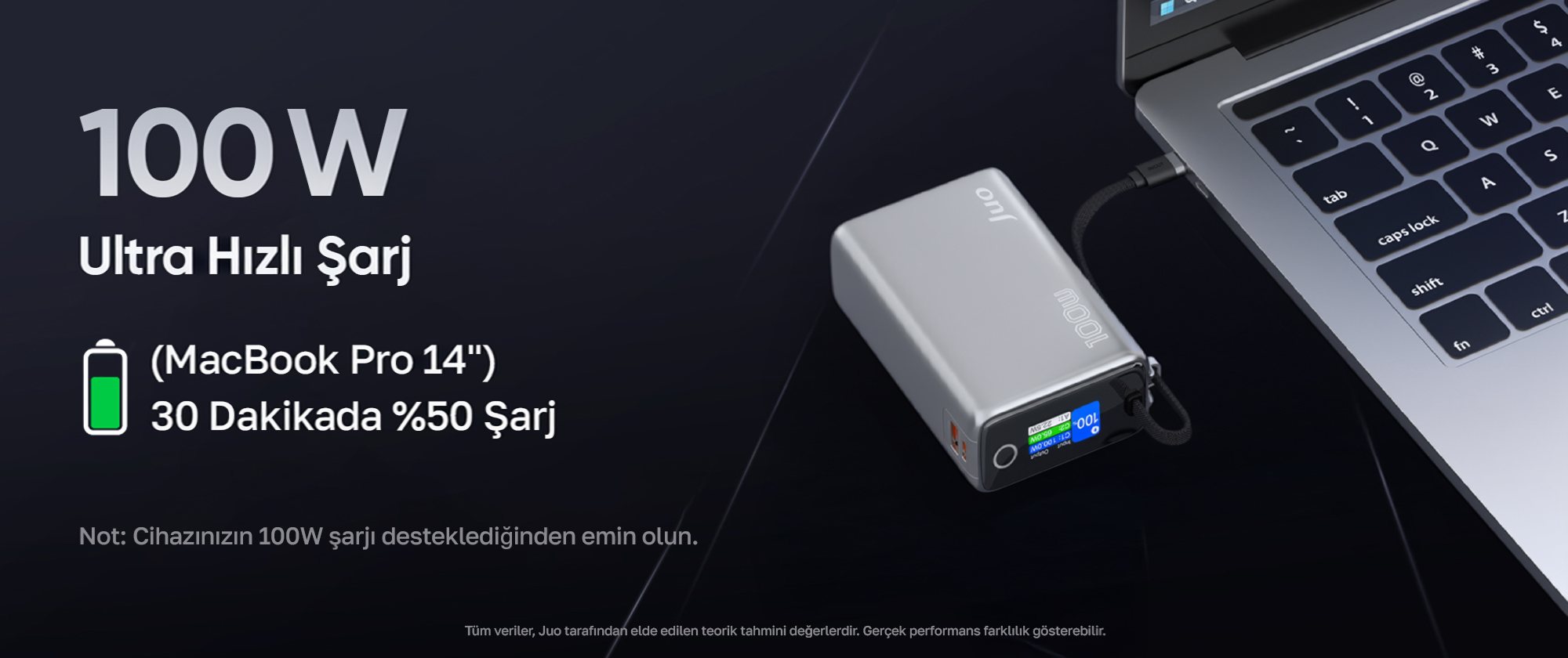 Juo Powerbank, 100W yüksek güç çıkışı ile telefon, tablet ve dizüstü bilgisayar gibi farklı cihazları hızlı bir şekilde şarj etmenize olanak tanır.