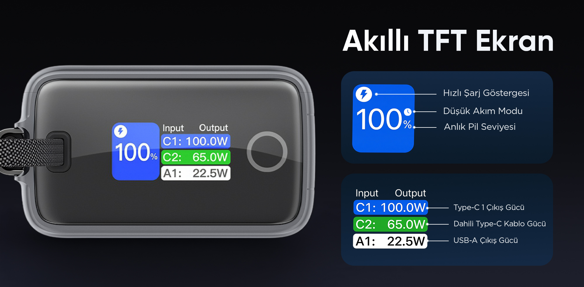 ile 100W ve USB-A port ile 22.5W maksimum çıkış gücüne sahiptir.