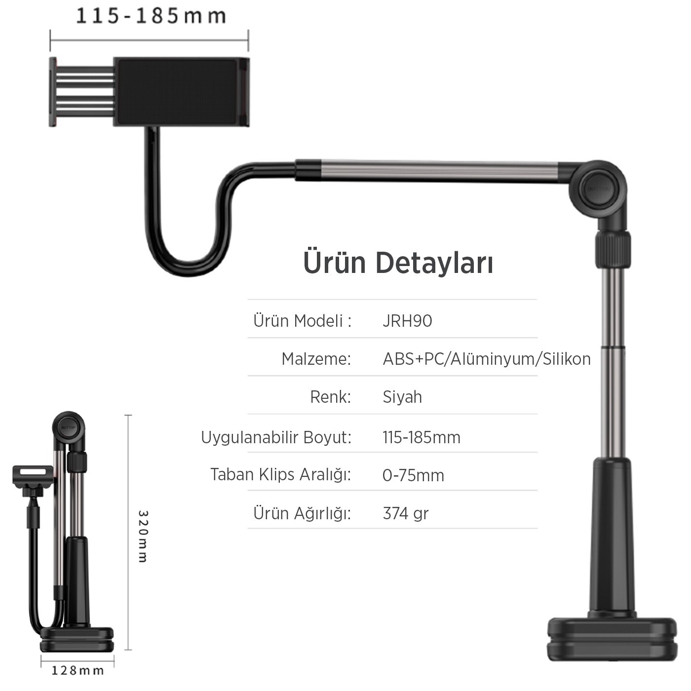 115-185mm arasındaki tüm akıllı telefonlar ve tabletler ile uyumludur. Telefon tutucu yada Tablet tutucu olarak kullanılabilir.