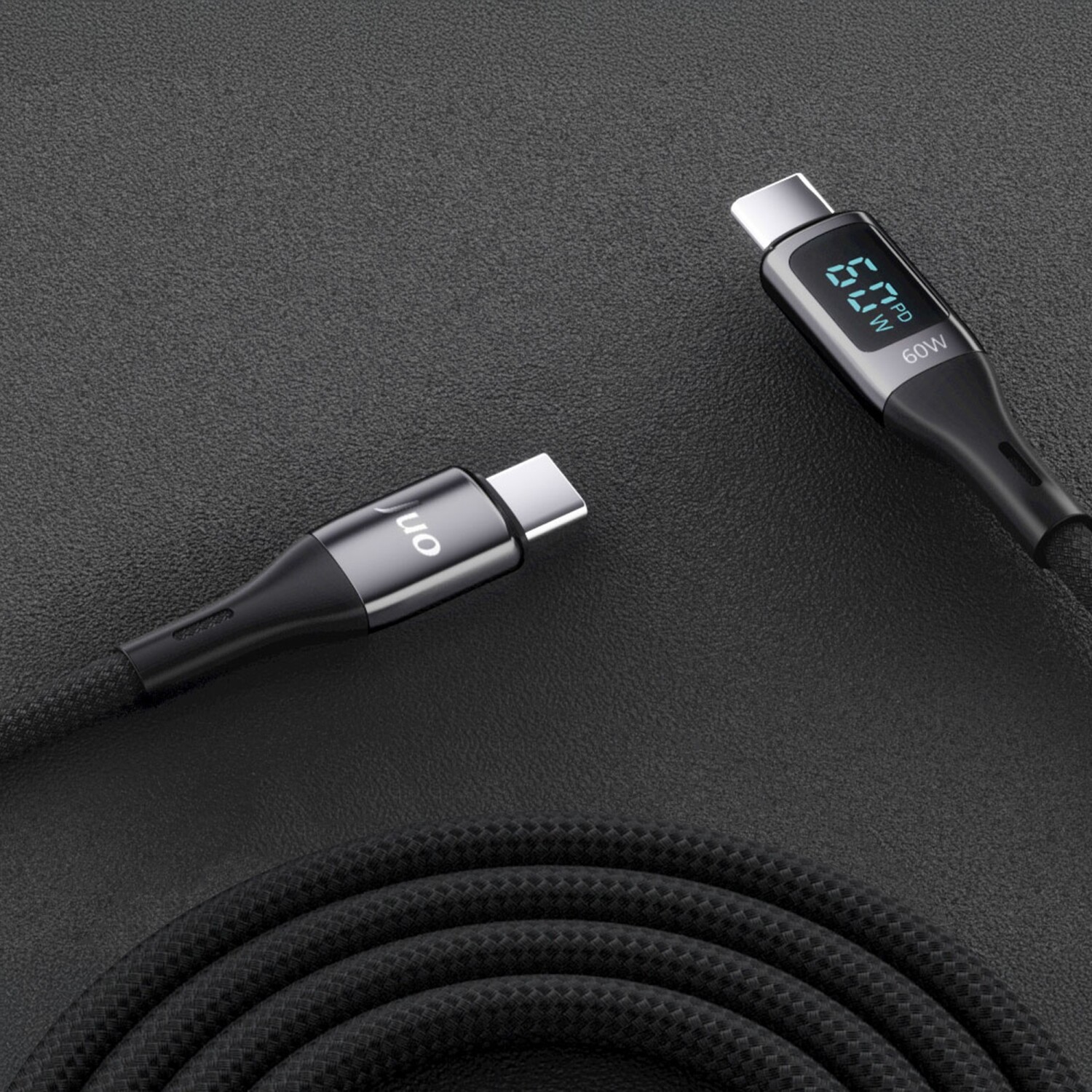 1 x Juo 60W Dijital Led Ekranlı Örgülü USB Type-C to Type-C Hızlı Şarj ve Data Kablosu 1 Metre