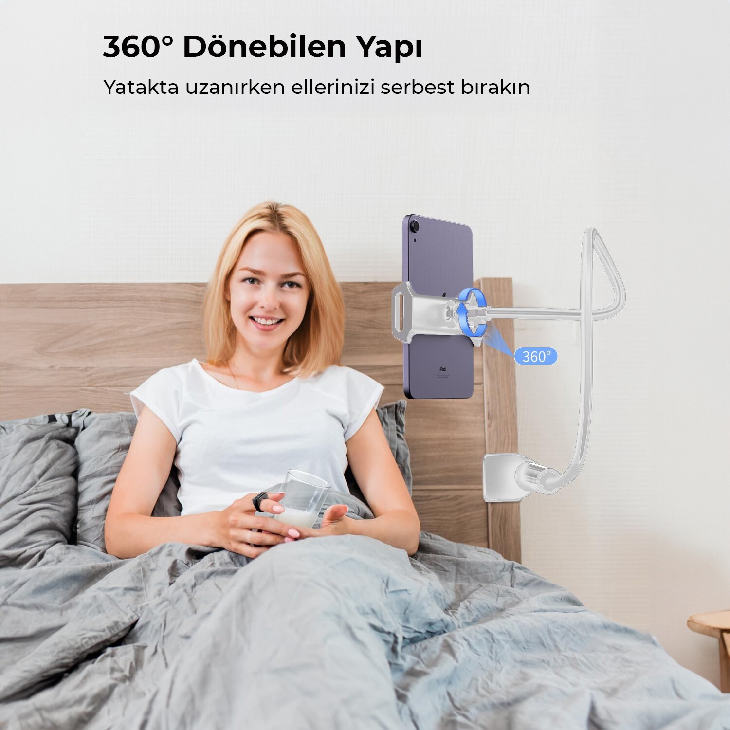 Bu esnek tablet tutucu, 360 derece dönebilen başlığı sayesinde hem yatay hem dikey kullanıma uygundur. Kaymaz tablet tutucu özelliği ile cihazınızı güvenle tutarken, 90 cm uzunluğundaki esnek gövdesi sayesinde istediğiniz pozisyonda kullanabilirsiniz.