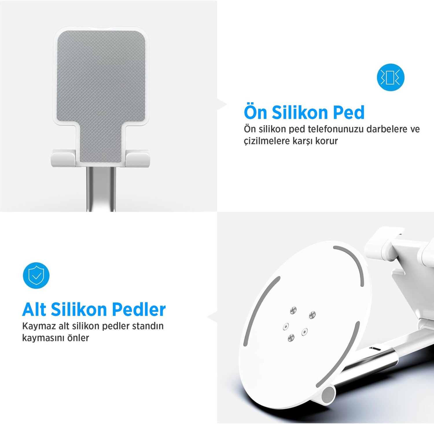 Masaüstü telefon tutucu, ABS plastik ve silikon malzemeden üretilmiş olup, soğuk haddelenmiş demir plaka tabanı sayesinde maksimum stabilite sağlar. Kaymaz taban özelliği ile güvenli kullanım sunar.