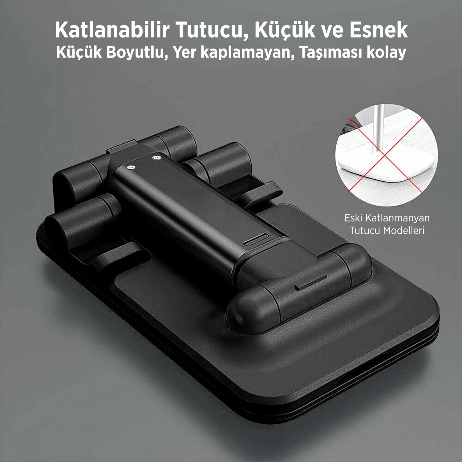 Katlanabilir telefon tutucu, 4.7 inç ile 6.7 inç arasındaki tüm akıllı telefonlarla uyumlu olup, kompakt boyutlarıyla her yere taşınabilir özellik sunar.