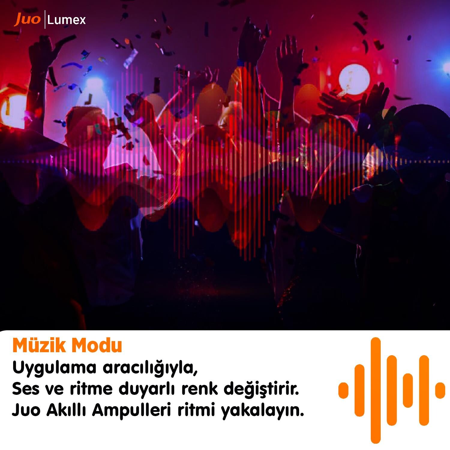 Juo Lumex Akıllı Ampul 9W RGB Wifi & Bluetooth, Juo JSB-09, eşsiz renk paletiyle size tam 16 milyon renk seçeneği sunarak evinizi benzersiz bir atmosfere dönüştürme imkanı sağlar. Her anın ruhuna uygun bir aydınlatma seçeneğiyle ortamınızı özelleştirin. Sadece bir dokunuşla, yaşam alanınızı renklendirin ve enerjinizi istediğiniz gibi ifade edin. Juo JSB-09’un karartma özelliği (Dim Özelliği) sayesinde, aydınlatmanızı kişisel tercihlerinize göre ayarlayabilirsiniz. Işığın yoğunluğunu kolayca düzenleyerek odanızdaki atmosferi anında değiştirin. Maksimum parlaklıktan sakin bir ambiyansa geçiş yapmak artık çok daha kolay. Juo JSB-09, ışık sıcaklığını 2700K ila 6500K arasında ayarlayabilme özelliği sunar. Bu geniş aralık, ortamınızın genel atmosferini anında değiştirmenizi sağlar. Sıcak ve davetkâr bir ışıktan, daha soğuk ve odaklanmış bir tonlu ışığa kadar istediğiniz her şeyi elde edin. Juo JSB-09, Google Home, Alexa ve IFTT ile entegre edilebilen sesle kontrol özelliğiyle yaşamınızı kolaylaştırır. Sadece sesinizle ampulu açabilir, kapatabilir ve istediğiniz renge ayarlayabilirsiniz. Bu, eller serbest kullanım ve maksimum konfor anlamına gelir. Juo JSB-09’u her an her yerden kontrol etme özgürlüğü sunar. Uzaktan erişim ile ışıklarınızı istediğiniz gibi yönetin. Zaman ayarları yapın, renkleri değiştirin ve yaşam alanınızı tek bir dokunuşla özelleştirin. Juo JSB-09, hızlı ve güvenilir Wi-Fi (802.11b/g/n) ile kablosuz iletişim kurarak sürekli bağlantıda kalmanızı sağlar. Bu sayede kesintisiz bir kullanım deneyimi yaşarken ampulünüzle sorunsuz bir şekilde etkileşime geçebilirsiniz. Juo JSB-09 ile evinizdeki tüm ışıkları kolayca yönetin. Tek bir dokunuşla grupları kontrol etmek, yaşam alanınızın her köşesini tam anlamıyla özelleştirmenize olanak tanır. Juo JSB-09 ile ışıklarınızı otomatik olarak zamanlayabilirsiniz. Günlük rutinlerinize uygun olarak ampulünüzü belirli saatlerde açabilir veya kapatabilirsiniz. Bu özellik, enerji tasarrufu sağlamanın yanı sıra yaşamınızı daha da kolaylaştırır. Uygulama aracılığıyla aktive edilen müzik modu, ses ve ritme duyarlı renk değişimleriyle eğlenceli bir atmosfer yaratmanıza olanak tanır. Partilerinizde veya sadece dinlenirken kullanıldığında, müzik modu yaşam alanınıza özel bir dokunuş katar. Non-Flicker özelliği, ışık yoğunluğunun anlık değişimini düzenleyerek gözlerinizi yormaz. Bu özellik, uzun süreli kullanımda bile konforlu bir aydınlatma sağlar. Göz sağlığınıza öncelik veren bu özellikle, Juo JSB-09 ile her anın tadını çıkarabilirsiniz.