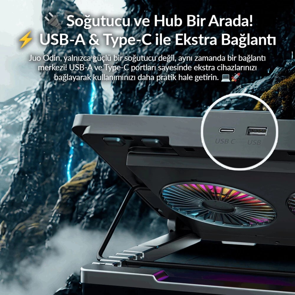 Juo Odin RGB Gaming Laptop Soğutucu dizüstü bilgisayarınızı serin tutarak performansını artırmak ve uzun ömürlü olmasını sağlamak için tam ihtiyacınız olan üründür. Yüksek hava akış gücüne sahip çift 110mm fanlı güçlü soğutma sistemi ile laptopunuzun aşırı ısınmasını engelleyerek en zorlu oyunlarda, yoğun grafik işlemlerinde ve uzun süreli çalışma seanslarında bile performansınızı korumanıza yardımcı olur. 2200 RPM fan hızı, sıcak havayı hızla dağıtarak cihazınızın optimum sıcaklıkta kalmasını sağlar. Üstelik, fan hız kontrolü sayesinde soğutma gücünü ihtiyacınıza göre ayarlayabilirsiniz.