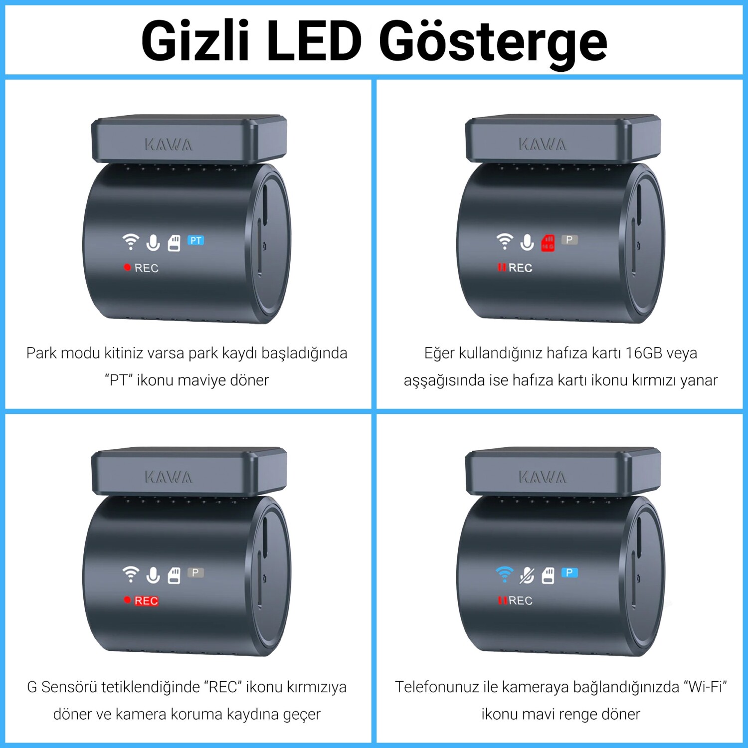 G-Sensör Uyarısı: Çarpışma veya ani sarsıntı algılandığında REC sembolü kırmızıya döner ve acil kaydı etkinleştirir.