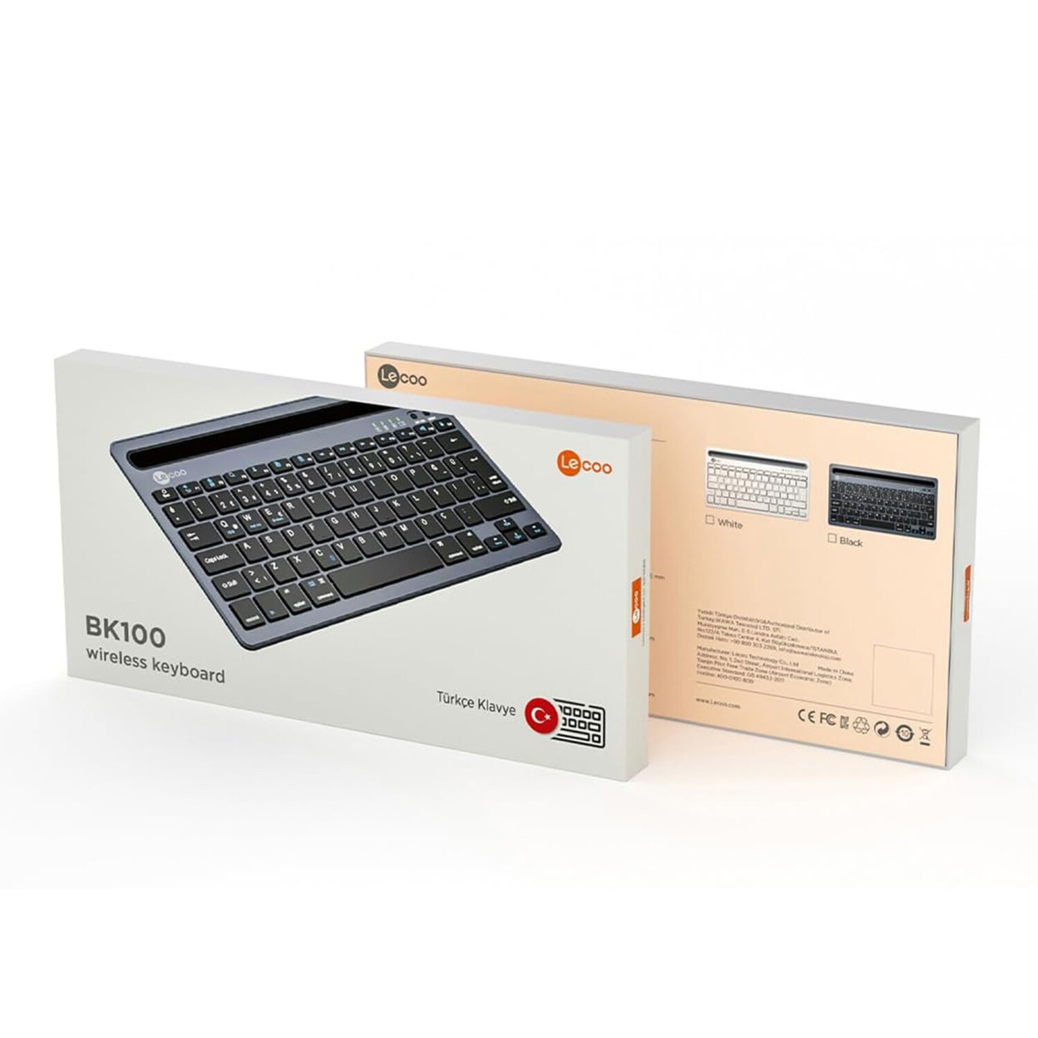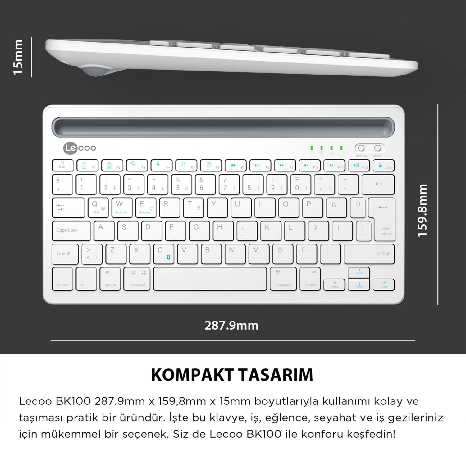 Lecoo BK100 Kablosuz Bluetooth Çoklu Cihaz ile Uyumlu Şarj Edilebilir,Telefon/Tablet Tutucu QWERTY Türkçe Q Klavye Beyaz