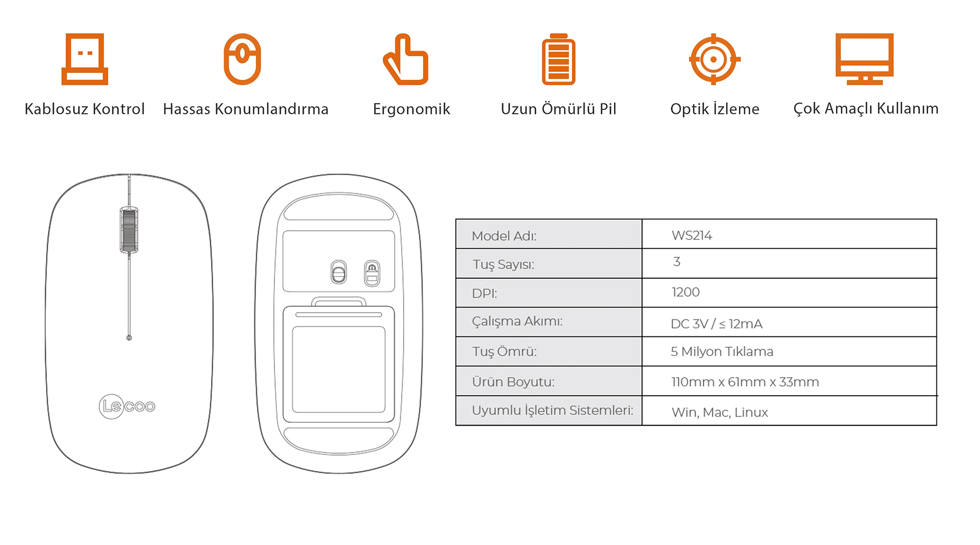Windows, Linux ve Mac OS dahil birçok işletim sistemi ile uyumlu olan Lecoo WS214, 10 metreye kadar kablosuz kullanım mesafesi sayesinde özgür hareket imkânı sunar.