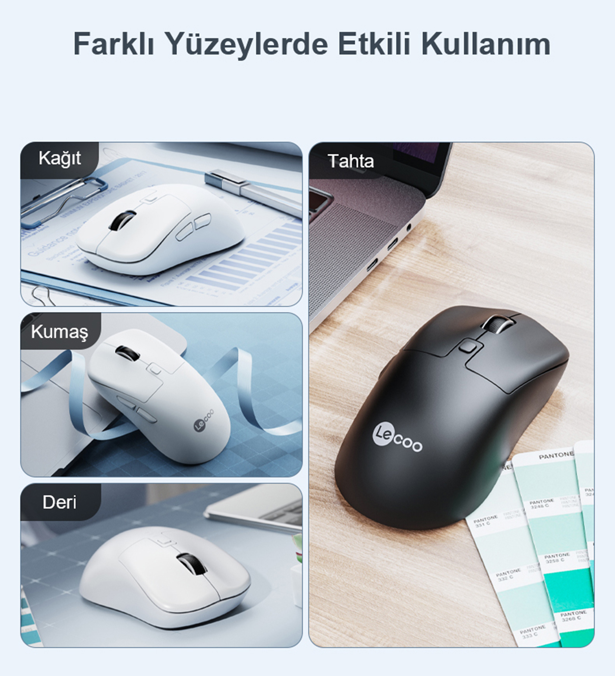 Lecoo WS216 Kablosuz Mouse, hem 2.4G kablosuz bağlantı hem de Bluetooth desteğiyle çok yönlü kullanım sunar. Sessiz tıklama teknolojisi, ergonomik tasarım ve geniş uyumluluk özellikleri sayesinde hem ofiste hem de evde üstün bir kullanıcı deneyimi sağlar. Hafif yapısı, enerji tasarruflu sistemi ve uzun kullanım ömrü ile günlük işlerinizi rahat, hızlı ve konforlu hâle getirir.