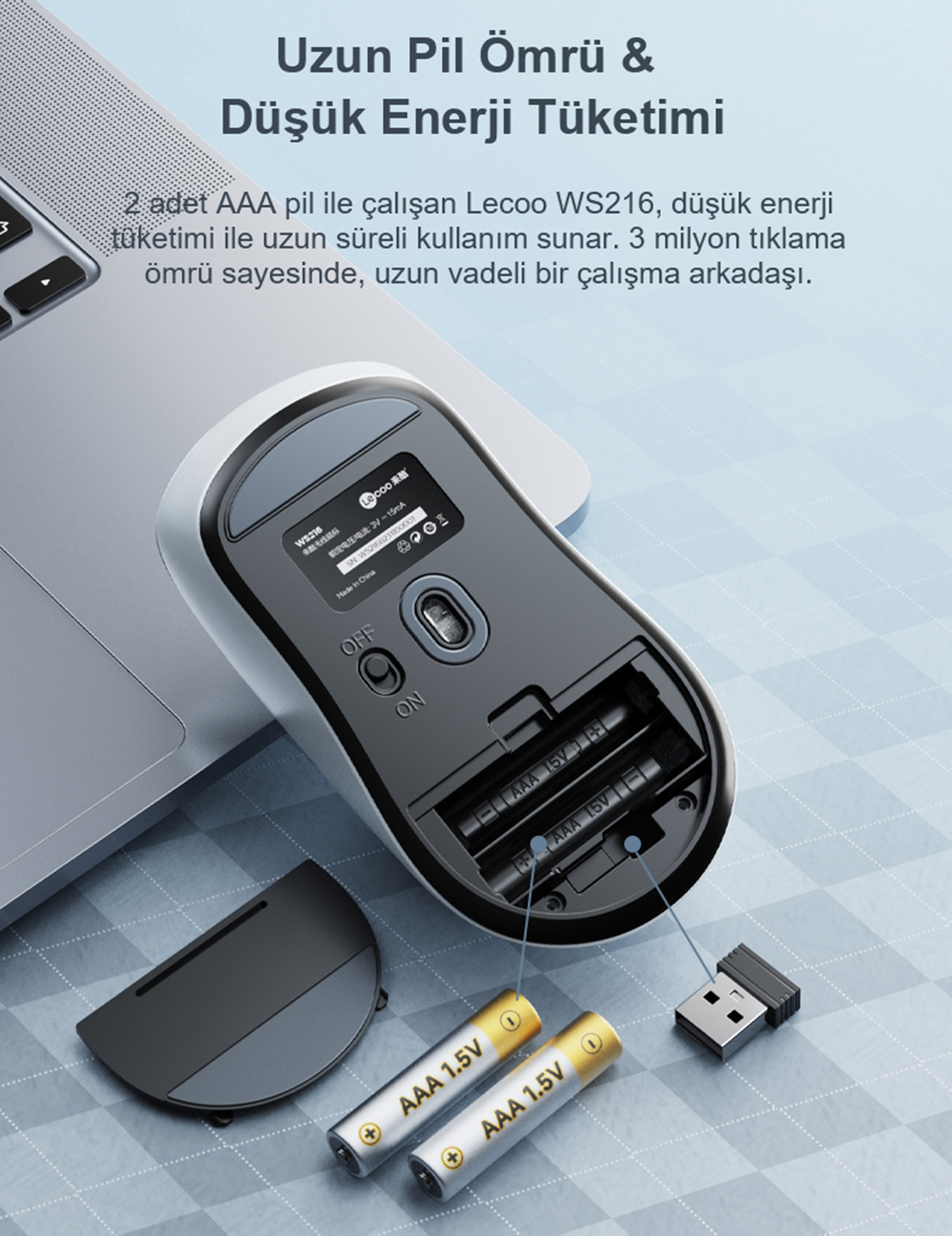 2 adet AAA pil ile çalışan Lecoo WS216, düşük güç tüketimi sayesinde uzun süre dayanıklılık sunar. 3 milyon tıklama ömrü, mouse’un uzun yıllar güvenle kullanılabileceğini gösterir.