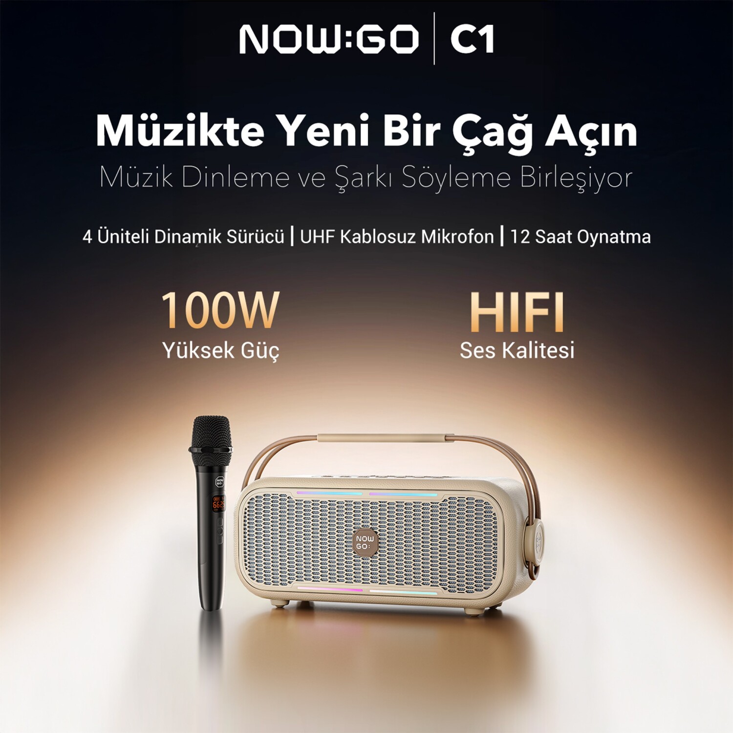 NOWGO C1, retro tasarımı ve 100W güçlü ses performansıyla öne çıkan bluetooth hoparlör modeli. Kablosuz mikrofon ile mikrofonlu karaoke hoparlör deneyimi sunan bu taşınabilir sistem, ev partilerinden açık hava etkinliklerine kadar her ortamda profesyonel ses kalitesi sağlar.
