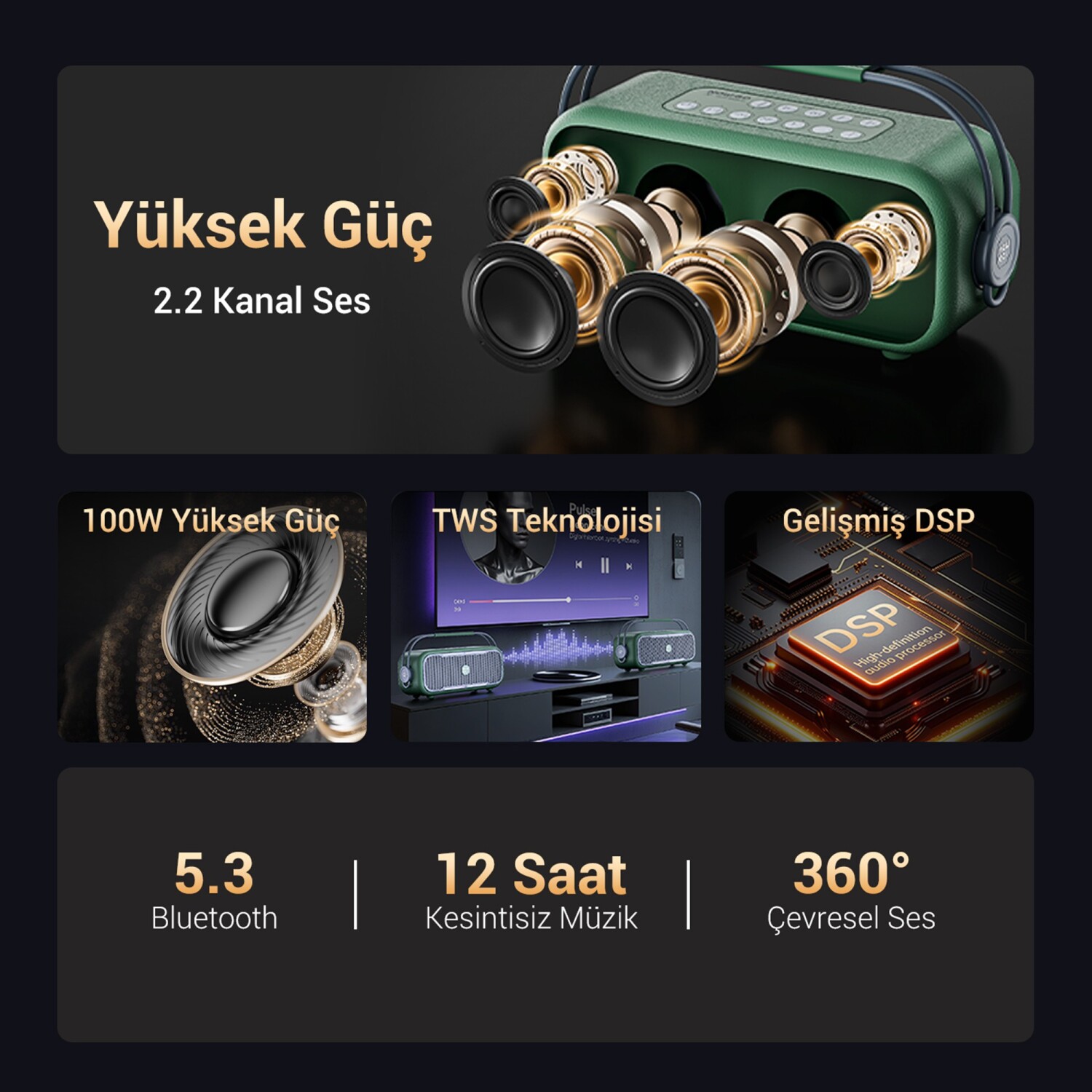 2.2 kanallı akustik tasarımıyla her frekansta net ve güçlü ses sunan bu bluetooth hoparlör, berrak tizler ve derin bas frekanslarıyla mükemmel bir dinleme deneyimi yaşatır. Mikrofonlu karaoke hoparlör özelliği sayesinde gerçekçi ses kalitesiyle şarkı söyleme keyfini yaşayabilirsiniz.