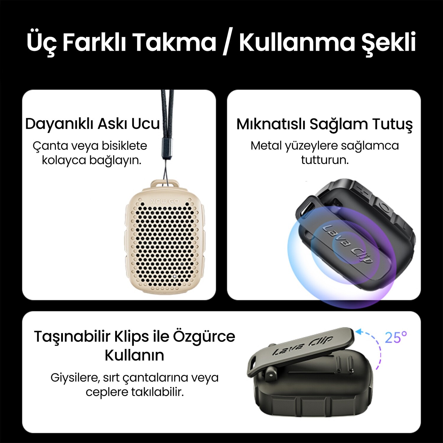 Now-Go LAVA CLIP, hafif yapısı ve güçlü klips tasarımıyla giysilerinize, çantanıza ya da ekipmanlarınıza kolayca takılabilen taşınabilir bir kablosuz hoparlördür. 5W ses gücüyle küçük boyutuna rağmen etkileyici bir ses performansı sunar. IP67 sertifikalı dayanıklı yapısı, 12 saate kadar çalma süresi ve dahili mikrofonuyla hem dış mekan aktiviteleri hem de günlük kullanım için ideal bir çözümdür.