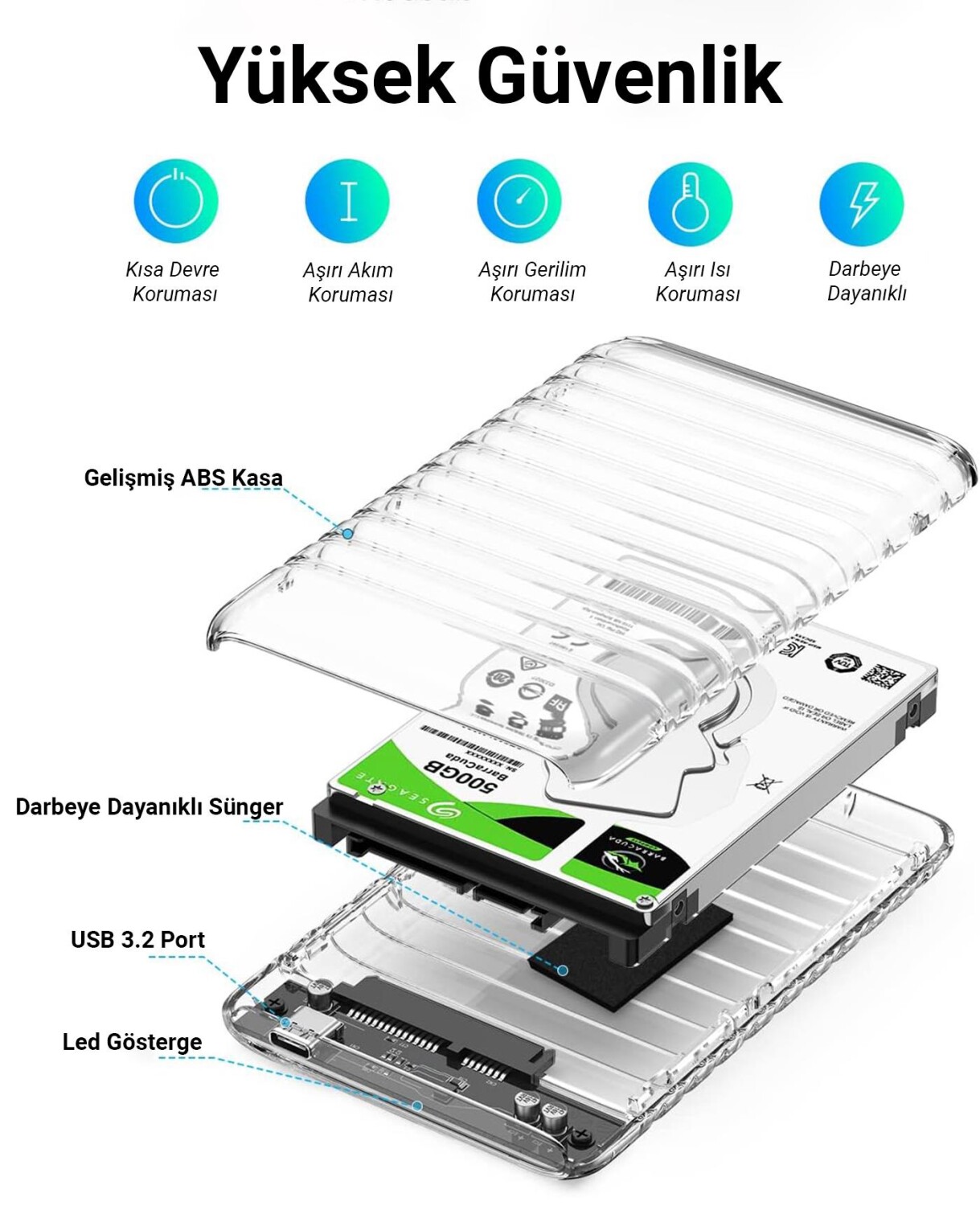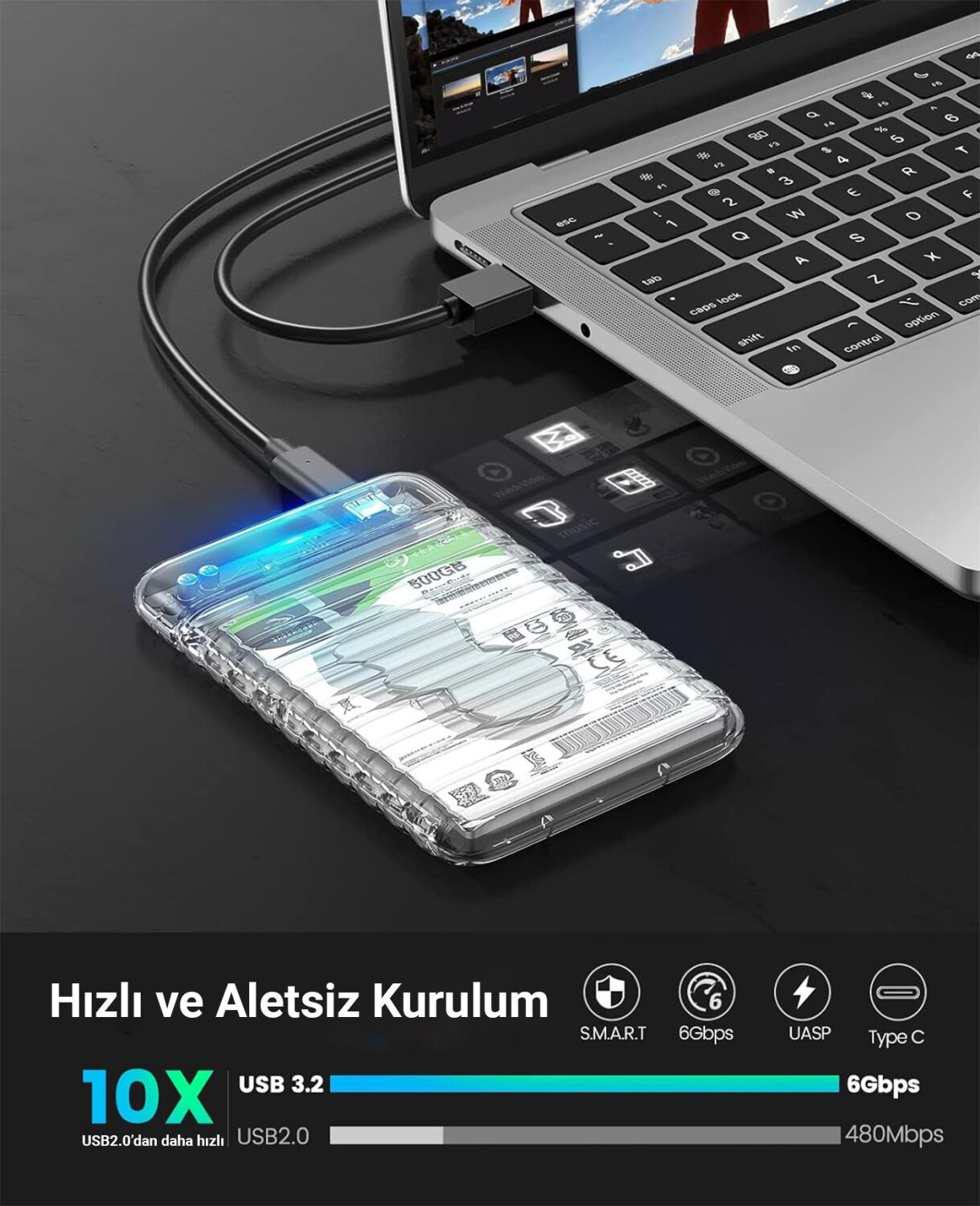 Orico USB3.2 Gen2 6Gbps Type-C 2.5” inch SATA SSD Hard Disk Kutusu Şeffaf, 2.5 inch boyutundaki HDD ve SSD lerinizi taşınabilir bir şekilde harici olarak kullanmanızı, dosyalarınızı görüntülemenizi ve dosya aktarmanızı sağlar. 6Gbps aktarım hızını destekleyen Type-C portu ile dosyalarınızı aktarmak çok daha kısa zaman almaktadır. Polikarbonat gövdesi disklerinizi darbelere karşı korumanın yanında ısıyı dağıtarak sabit disk ve SSD lerinizin daha uzun ömürlü çalışmasını sağlar. Şeffaf yapısı sayesinde içinde bulunan belleği görebilirsiniz böylece RGB seçeneği bulunan bellekler tercih edebilirsiniz. Herhangi bir sürücü kurulumuna ihtiyaç duymadan tak çalıştır olarak kullanabilirsiniz. Kızaklı tasarımı sayesinde kutu içerisindeki belleği değişmek veya çıkartmak için zaman kaybetmezsiniz. Sıradan hard disk ssd okuyuculara göre %70 daha hızlı olan UASP TRIM SATA protokolünü desteklemektedir. Üzerinde bulunan mavi led ile cihazınızın çalışıp çalışmadığını kontrol edebilirsiniz. 10 dakika boşta kalması durumunda uyku moduna geçerek hard disk ssd kutusunun kullanım ömrünü uzatmaktadır. 2.5” inch 7mm/9,5mm boyutlarında maksimum 6 TB diskleri desteklemektedir.