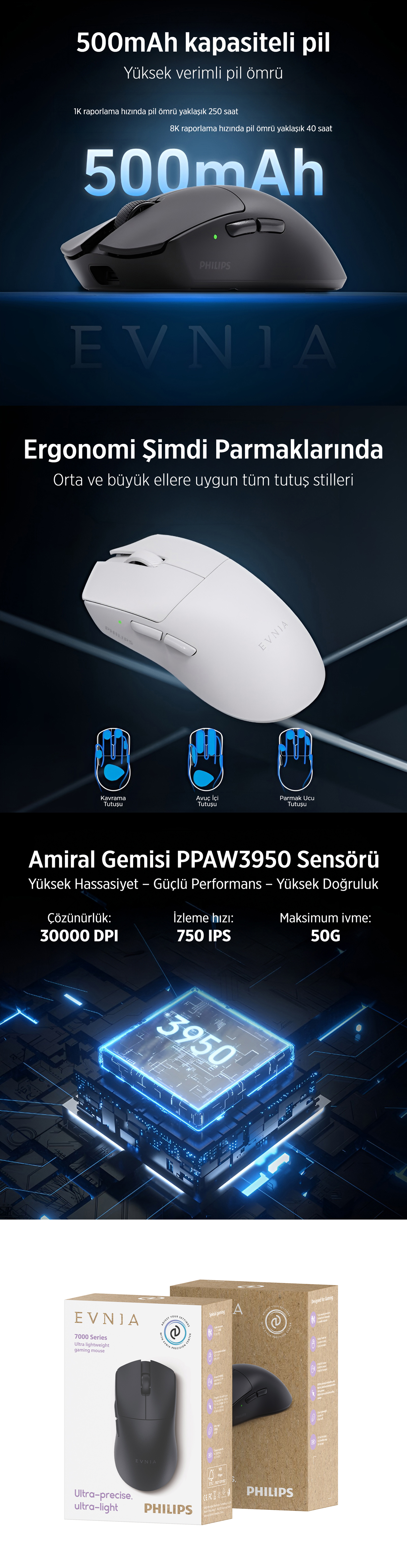 Philips Evnia SPK9718B Lightweight PAW3950 Sensör 36000 DPI 3 Modlu Gaming Oyuncu Mouse, PAW3950 sensör ve Omron Light teknolojisi ile nişangâhı veya imleci milimetrik hassasiyetle kontrol et. Her hareket anında ekrana yansır, rakiplerinden bir adım önde olmanı sağlar.