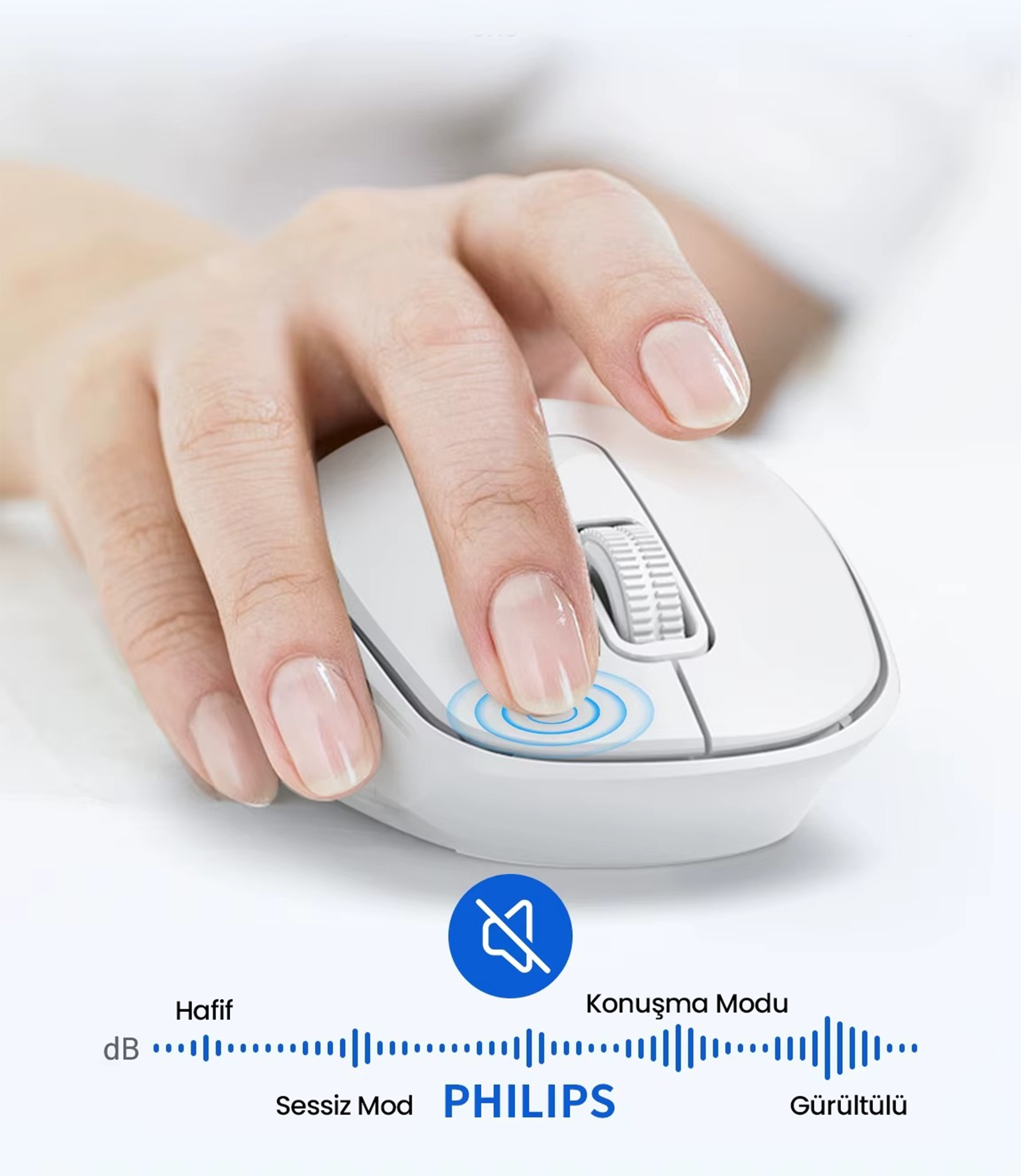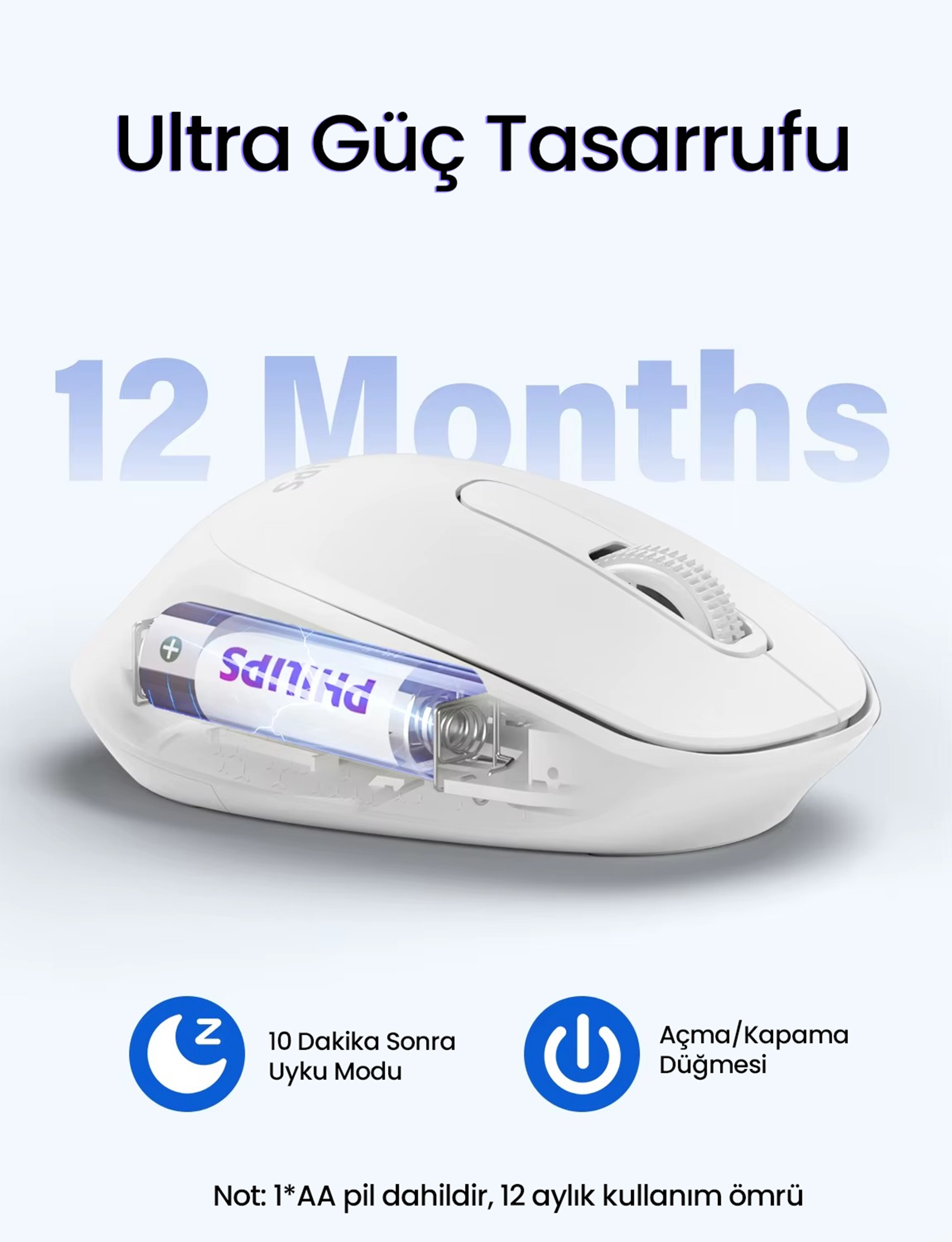 Tek bir AA Philips pil ile uzun süreli kullanım sağlayan fare, enerji tasarruflu yapısı sayesinde sık pil değiştirme ihtiyacını en aza indirir.