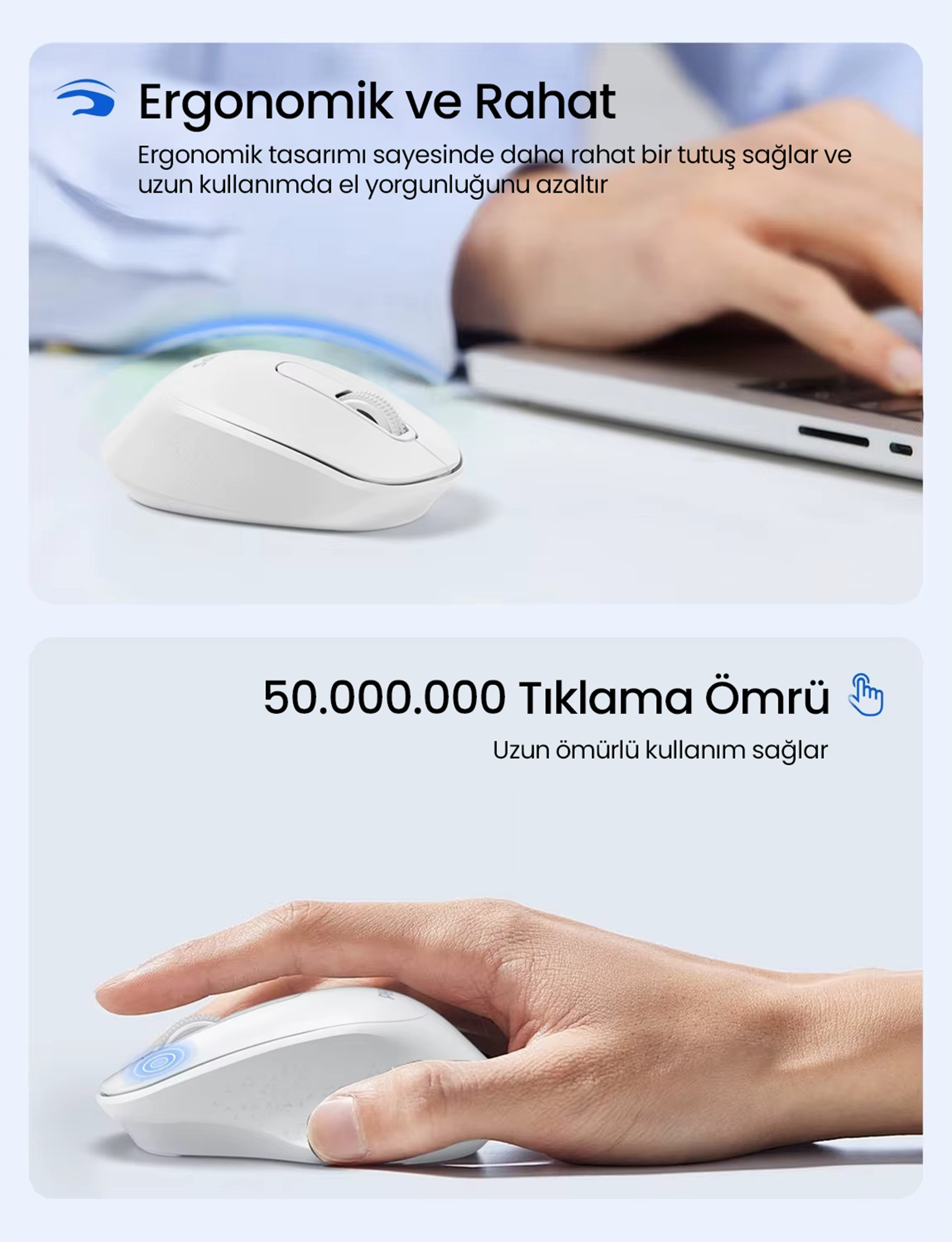 Fare üzerindeki 3 tuşlu tasarımı, günlük işlerinizi hızlandırır ve daha verimli bir kullanım sunar. Navigasyon ve tıklama işlemleri daha pratik hale gelir.