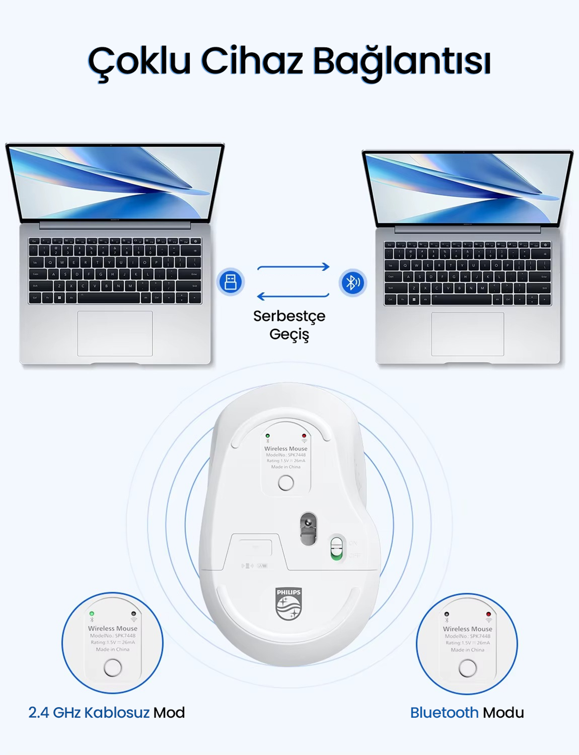 Bu fare 2.4GHz kablosuz bağlantı, Bluetooth 3.0 ve Bluetooth 5.0 olmak üzere üç farklı bağlantı seçeneği sunar. 2.4GHz modunda 15 metre, Bluetooth modlarında ise 10 metre etkili kullanım mesafesi ile kesintisiz ve stabil bağlantı sağlar.