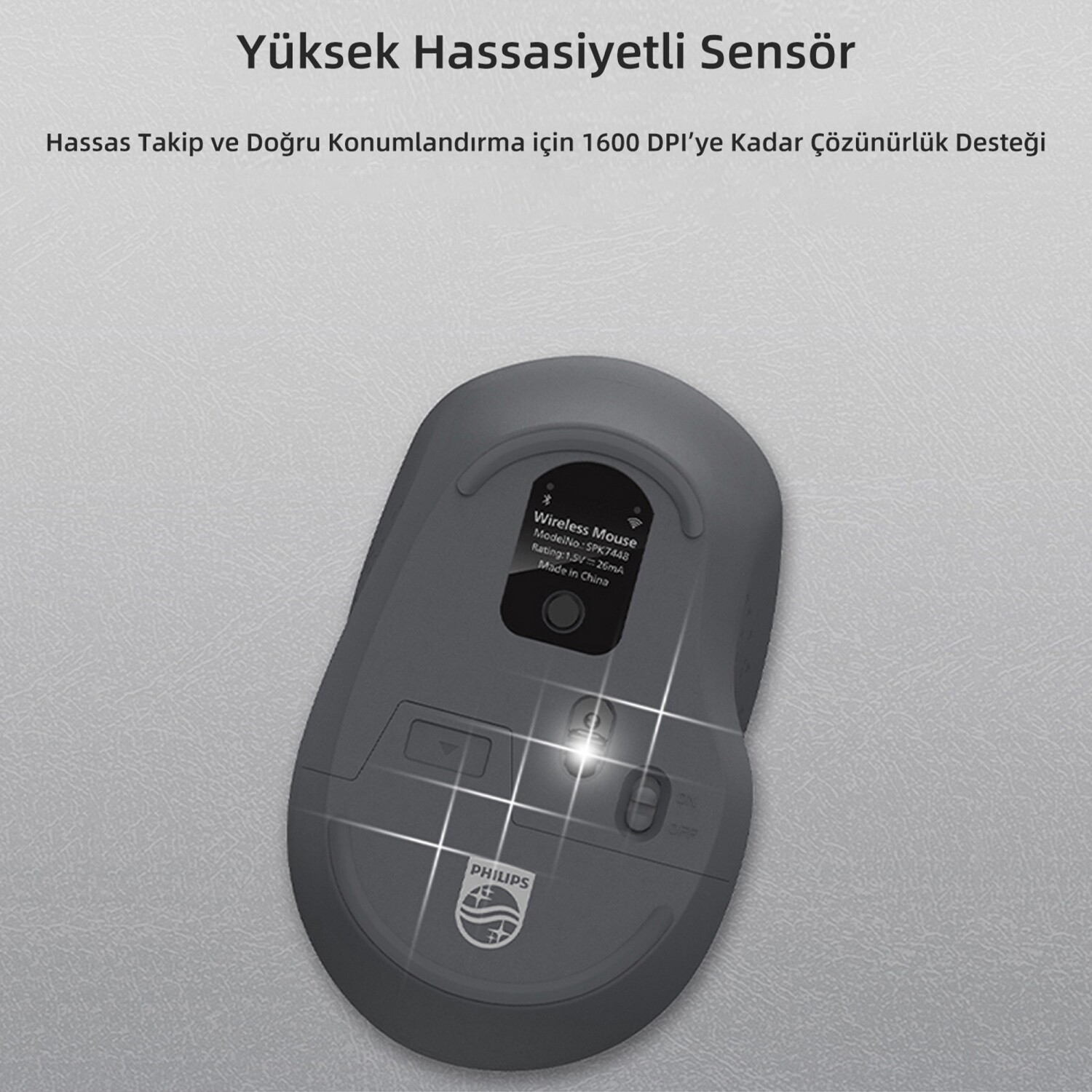 Tek bir AA Philips pil ile uzun süreli kullanım sağlayan fare, enerji tasarruflu yapısı sayesinde sık pil değiştirme ihtiyacını en aza indirir.