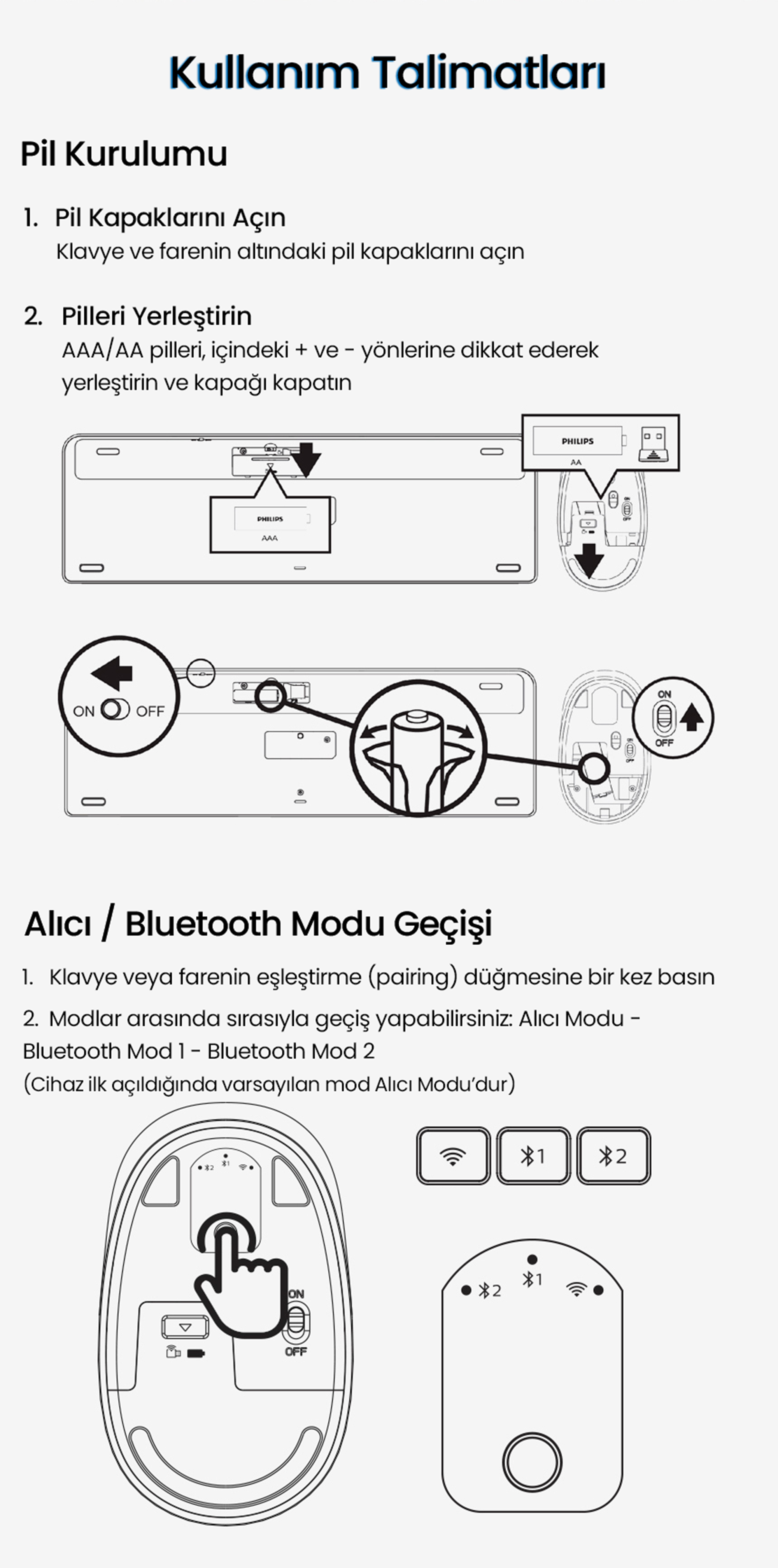 Fare: 1×AA Philips pil, Klavye: 1×AAA Philips pil