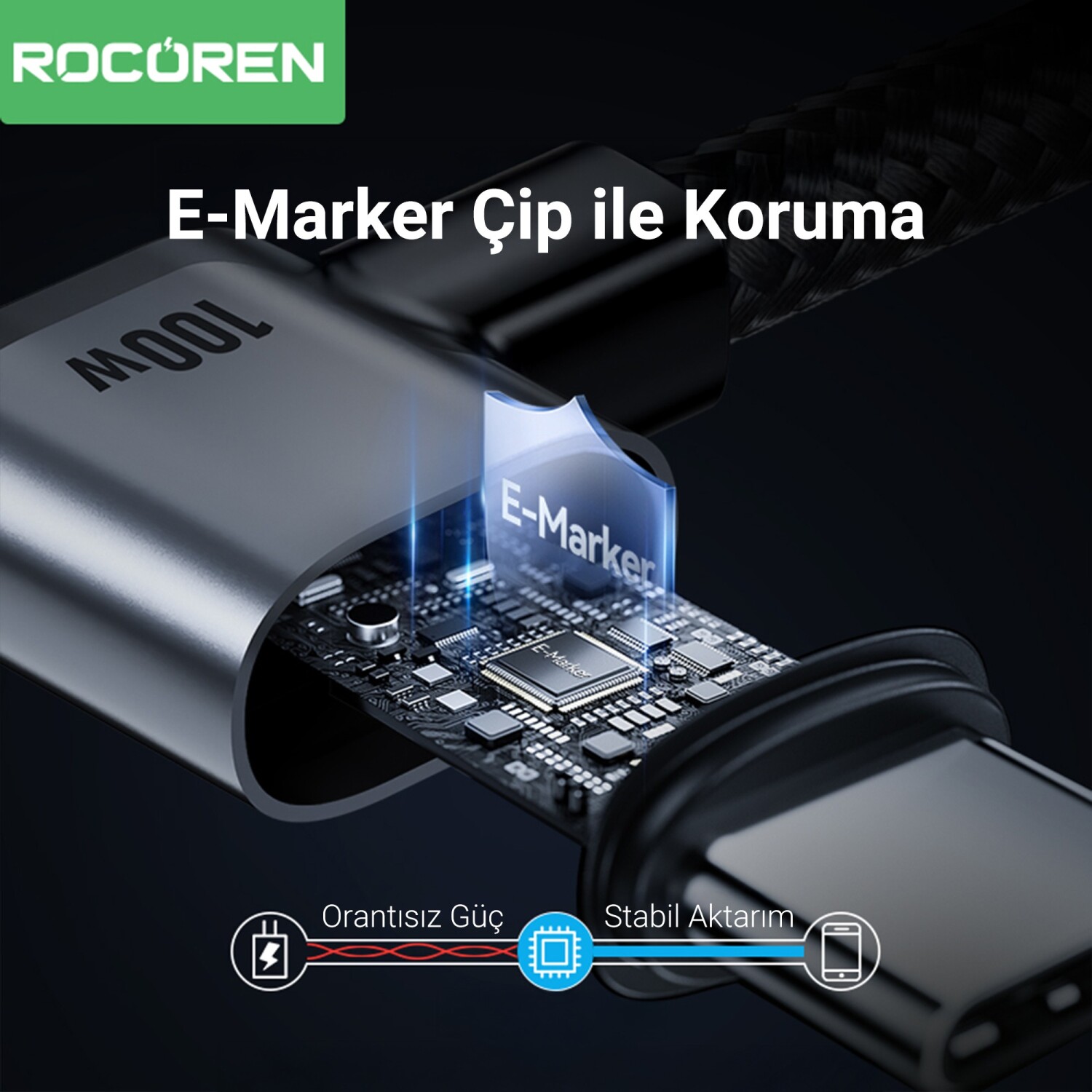 PD 100W güç iletimi, QC3.0, AFC, PPS, SCP ve FCP gibi hızlı şarj protokolleriyle geniş uyumluluk sunarak dizüstü bilgisayarlar, tabletler ve akıllı telefonlar için ideal bir seçimdir. E-Marker çipi, güvenli güç aktarımı sağlayarak aşırı akım ve kısa devre koruması sunar. Saf bakır iç tel, maksimum iletkenlik sağlarken, örgü kablo kaplaması bükülmelere ve aşınmalara karşı ekstra dayanıklılık sunar.