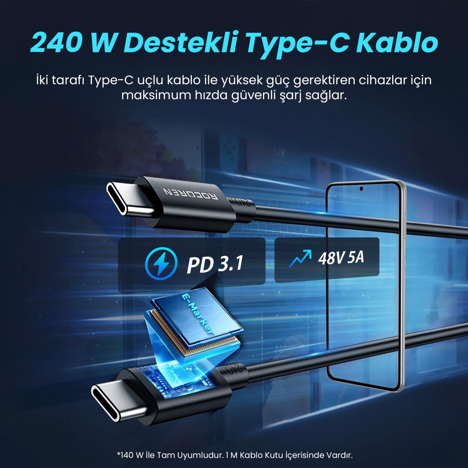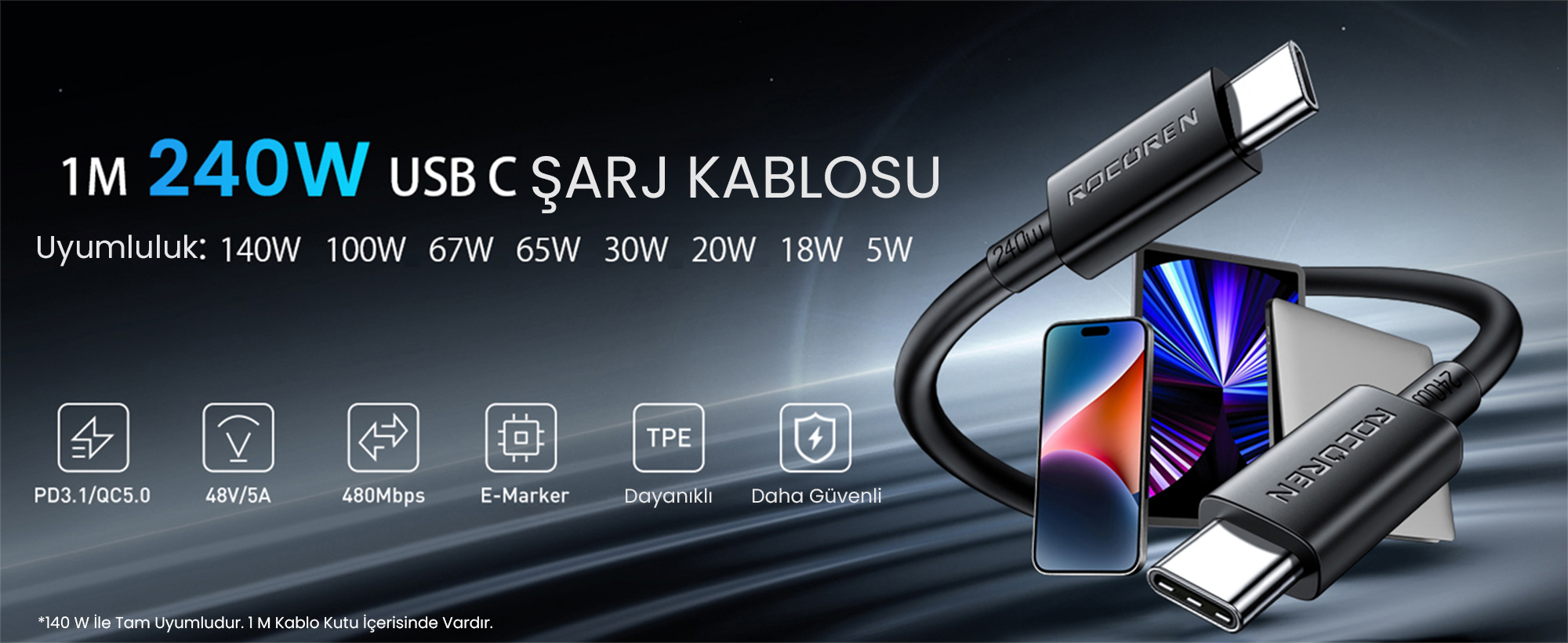 Ürünle birlikte gelen 1 metre uzunluğundaki Type-C to Type-C şarj kablosu, E-Marker akıllı çipi ve dayanıklı TPE malzemesi sayesinde 240W'a kadar güç iletimini destekler. Ekstra bir yüksek hızlı kablo arayışına girmeden doğrudan kullanıma başlayabilirsiniz.